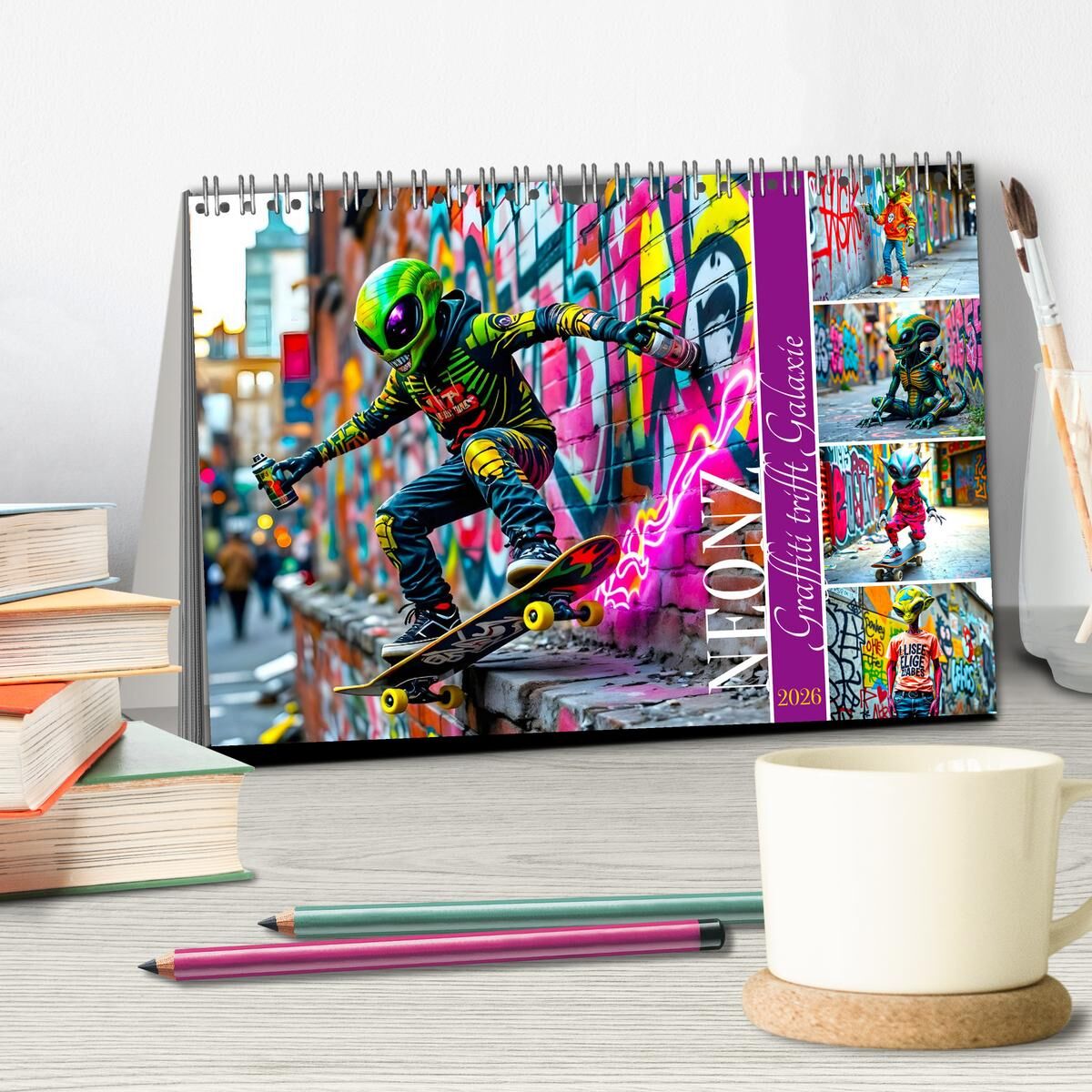 Dieser außergewöhnliche KI generierte Kalender bringt dir jeden Monat ein neues, abgefahrenes Motiv: coole skatende Aliens rollen durch Betonlandschaften, posieren vor knalligen Graffiti-Wänden und bringen Farbe in jeden Monat. Eine Mischung aus Science-Fictio...