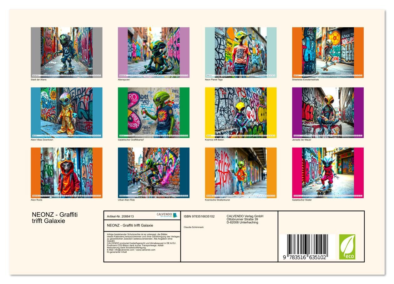 Dieser außergewöhnliche KI generierte Kalender bringt dir jeden Monat ein neues, abgefahrenes Motiv: coole skatende Aliens rollen durch Betonlandschaften, posieren vor knalligen Graffiti-Wänden und bringen Farbe in jeden Monat. Eine Mischung aus Science-Fictio...