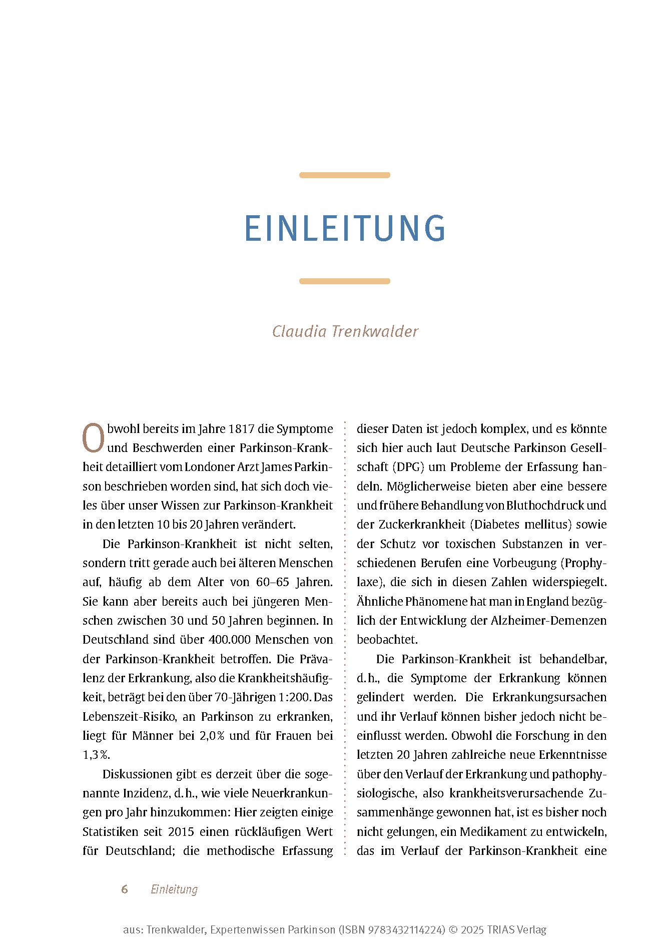 Neue Chancen für Parkinson-Patienten In den letzten Jahren haben sich die Therapien von Parkinson enorm weiterentwickelt. Prof. Claudia Trenkwalder stellt Ihnen diese vor. Als eine der führenden Parkinson-Expertinnen in Deutschland ist sie ganz nah dran an de...