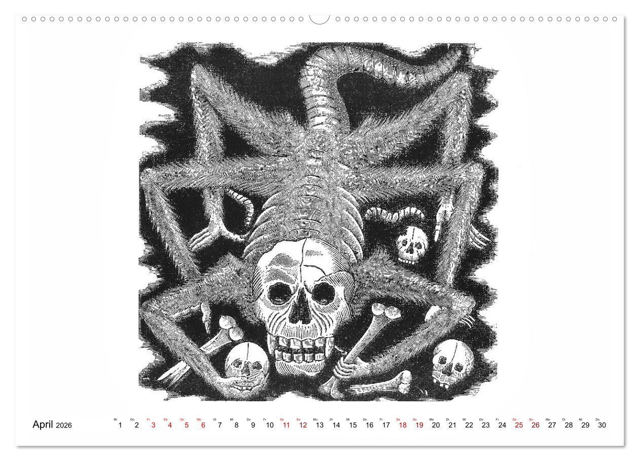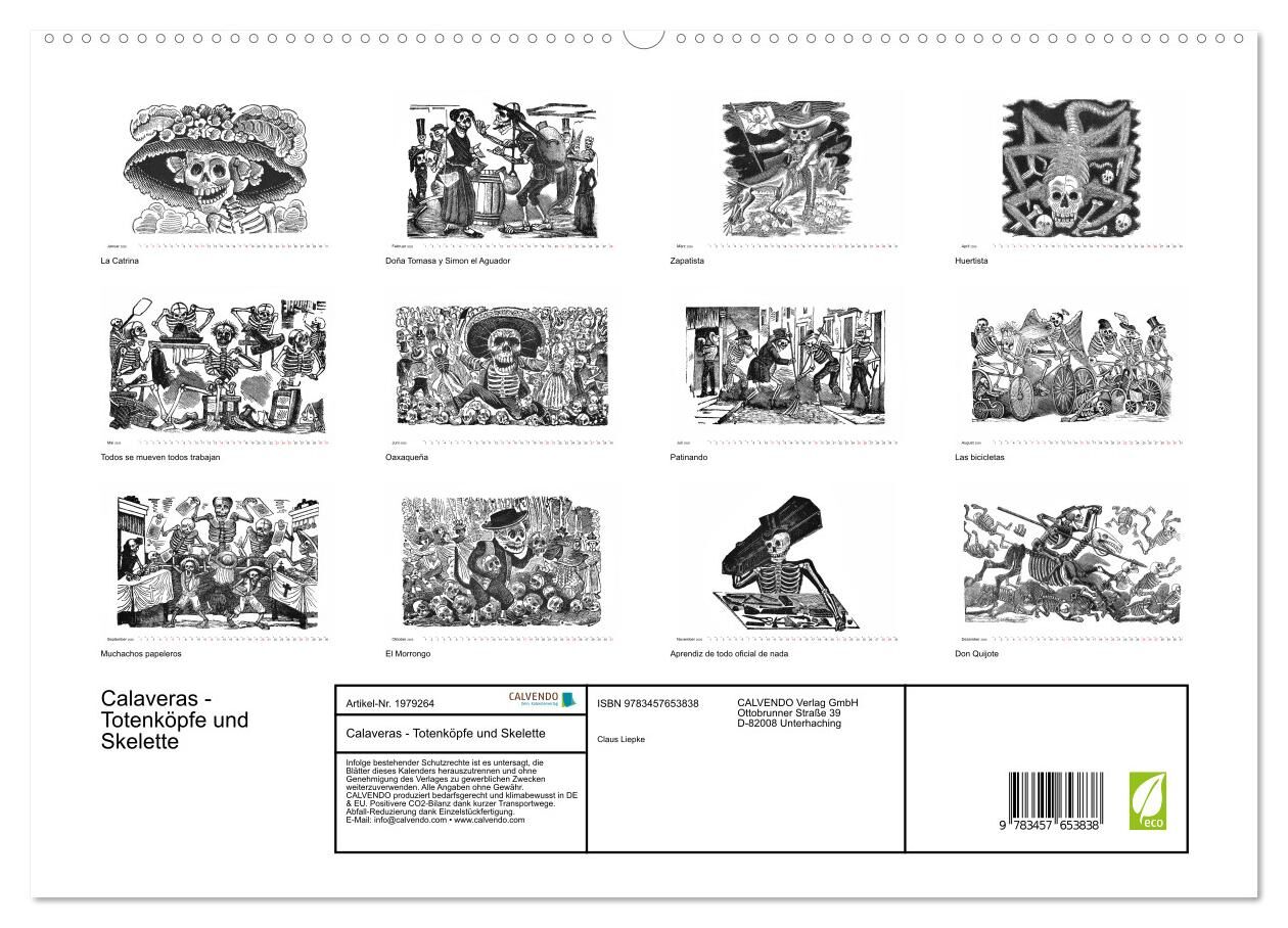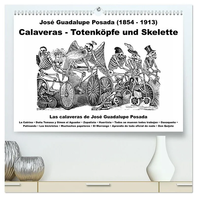 Unser Kalender zeigt Ihnen die berühmten Skelette des Mexikaners José Guadalupe POSADA (1854 - 1913) - die Calaveras - im Alltag: La Catrina (beliebt zum Tag der Toten - Dia de los muertos), Doña Tomasa y Simon el Aguador, Zapatista, Huertista, Oaxaqueña, Pati...