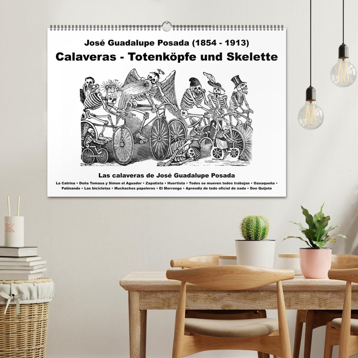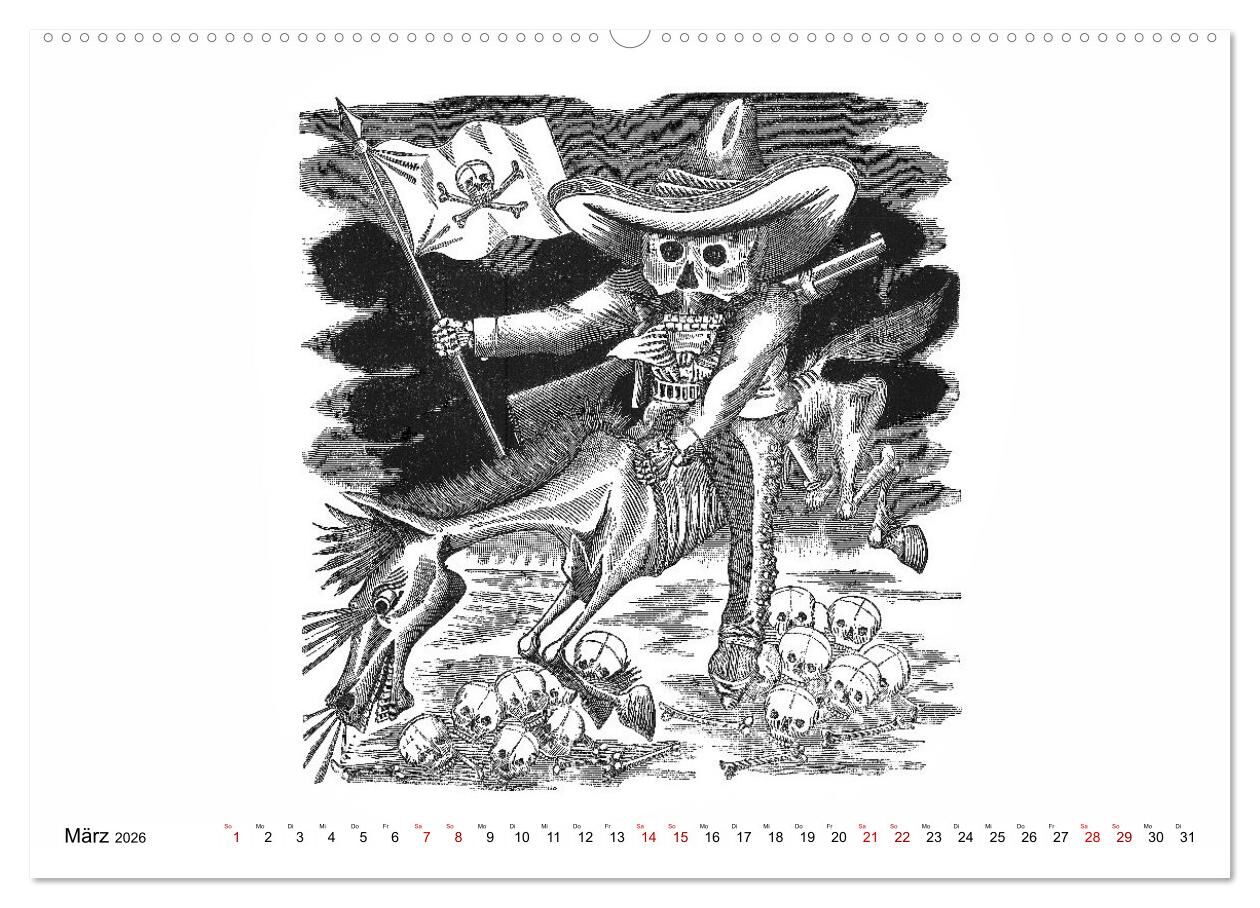 Unser Kalender zeigt Ihnen die berühmten Skelette des Mexikaners José Guadalupe POSADA (1854 - 1913) - die Calaveras - im Alltag: La Catrina (beliebt zum Tag der Toten - Dia de los muertos), Doña Tomasa y Simon el Aguador, Zapatista, Huertista, Oaxaqueña, Pati...