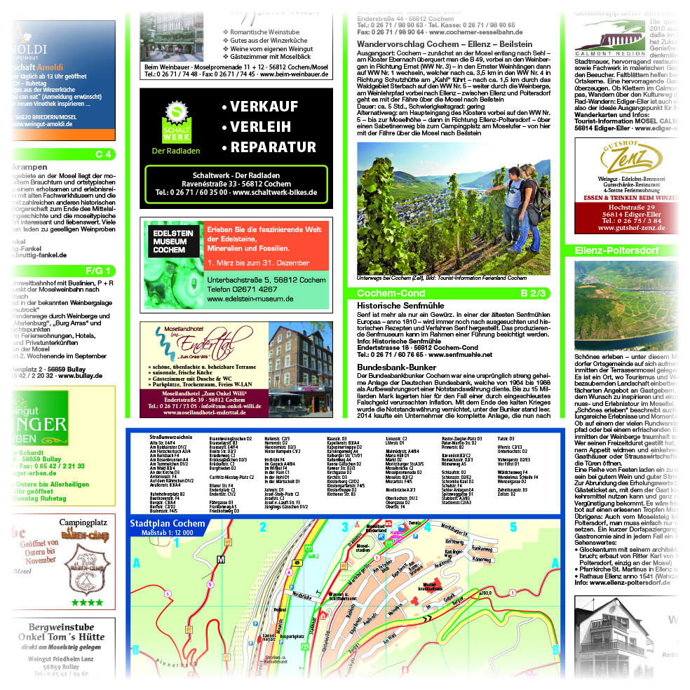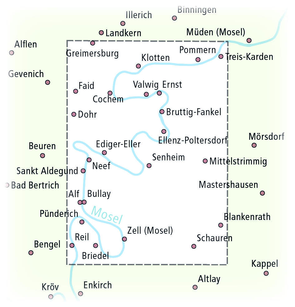 Weinberge, die Mosel und herrliche Landschaft kennzeichen die Gegend von Cochem bis Zell und machen sie zum idealen Wandergebiet. Zahlreiche Wander- und Radwanderwege dokumentieren das auf der übersichtlichen Karte. Neben regionalen Strecken entlang der Mosel ...