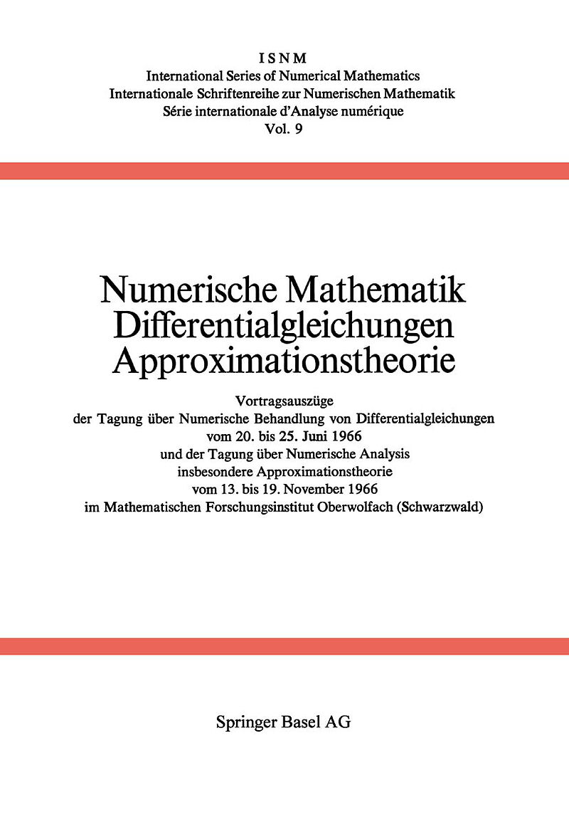 Tagung über Numerische Behandlung von Differentialgleichungen 20. bis 25. Juni 1966.- Monte-Carlo-Methoden zur Lösung elliptischer Randwertprobleme.- Zur Frage der Verallgemeinerung des Äquivalenzsatzes von P.D. Lax.- Optimierungsprobleme numerischer Methoden.- Ein Charakteristikenverfahren für instationäre Strömungen entlang bewegter Wände.- Stabilitätskriterien in Abhängigkeit von den Normen für die Startwerte.- Neue Lie-Reihen-Methode.- Defekterfassung bei gewöhnlichen und partiellen Differentialgleichungen.- Ein neues Runge-Kutta-ähnliches Verfahren.- Zur Konvergenz des Ritzschen Verfahrens und der Fehlerquadratmethode I.- Einheitliche Herleitung einer umfassenden Klasse von Interpolationsformeln und Anwendung auf die genäherte Integration von gewöhnlichen Differentialgleichungen.- Ein Rekursionsverfahren zur Lösung linearer Differentialgleichungssysteme mit singulären Koeffizientenmatrizen.- Fehlerschranken für die genäherte Lösung von Rand- und Eigenwertaufgaben bei gewöhnlichen Differentialgleichungen durch Differenzenverfahren.- Zur Fehlererfassung bei der numerischen Integration von gewöhnlichen Differentialgleichungssystemen erster Ordnung mit speziellen Zweipunktverfahren.- Stabilitätsbereiche bei Diskretisierungsverfahren für Systeme gewöhnlicher Differentialgleichungen.- Über Konvergenzbereiche von Differenzapproximationen bei quasilinearen hyperbolischen Anfangswertproblemen.- Wärmeleitung in Systemen mit mehreren Komponenten.- Zur numerischen Behandlung der Randwertaufgaben für elliptische Systeme.- Lösungsschranken beim Differenzenverfahren zur Potentialgleichung.- Tagung über Numerische Analysis insbesondere Approximationstheorie vom 13. bis 19. November 1966.- Zur stetigen Abhängigkeit der Menge der besten Approximierendeneines Elementes in einem normierten reellen Vektorraum.- Rationale Tschebyscheff-Approximation differenzierbarer Funktionen.- A Note on Nonlinear Approximation Theory.- Approximationen durch Umordnungen von Lie-Reihen.- Über nichtlineare Approximationen in linearen normierten Räumen.- Über ein Kriterium von Kolmogoroff bei der Approximation von Funktionen.- Optimal Approximation and Error Bounds in Normed Spaces.- Anwendungen einer Fehlerschranken-Arithmetik.- Extrapolation bei monoton zerlegbaren Operatoren.- On best L2 Spline Approximations.- Monotonie-Aussagen bei quasilinearen elliptischen Differentialgleichungen und anderen Problemen.- Approximation with Singular Integrals of the Jackson Type.- Über Potenzen von verallgemeinerten Bernsteinoperatoren.- Über verallgemeinerte numerische Integrationen.- Diskretisierung bei Tschebyscheff-Approximation mit verallgemeinerten rationalen Funktionen.- Lösungsschranken bei elliptischen Differentialgleichungen.