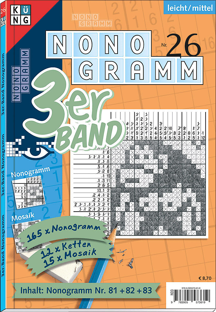 Im Nonogramm 3er-Band Nr. 26 sind drei Ausgaben des Magazins Nonogramm aus dem Küng Rätsel Sortiment zusammen gebunden. Insgesamt umfasst der 3er-Band über 160 Nonogramm-Rätsel in schwarzweiss, aber auch Ketten-Rätsel (Hashi) und Mosaik-Rätsel. Nonogramm ist a...
