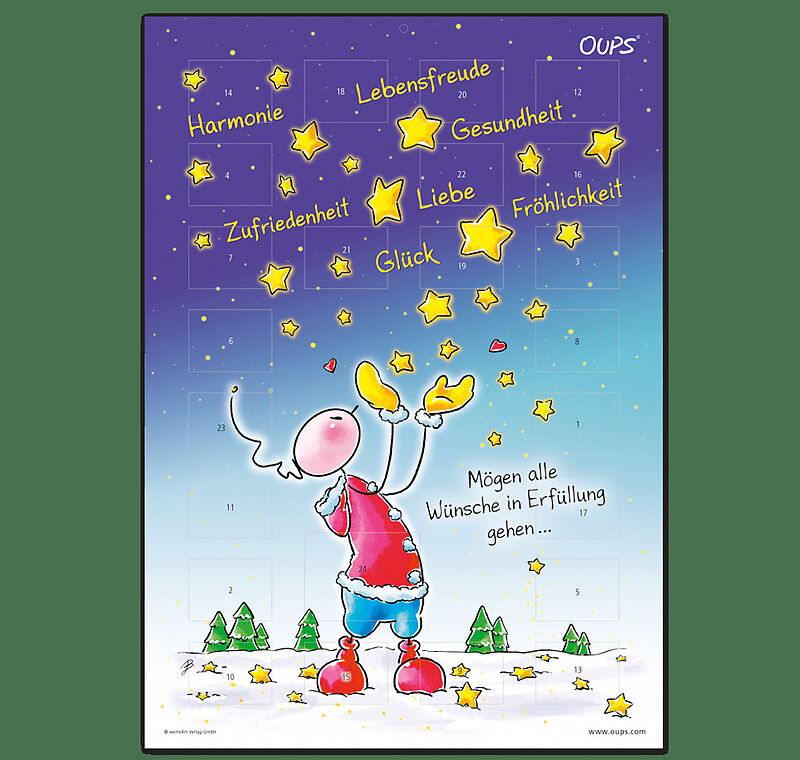 Adventkalender mit 24 Türchen für die Adventzeit. Adventkalender zum Aufhängen: jedes Türchen mit einer Herzensbotschaft und einem liebenswerten Oups-Bild. © werteArt Verlag, Illustration: Johannes Böttinger Texte: Kurt Hörtenhuber Urheberin Figur Oups: Conny ...