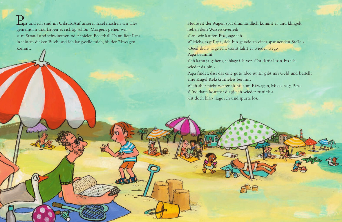 Papa und Mika machen Strandurlaub: Sonnenschirm aufbauen, baden, lesen, Federball spielen. Bis der Eiswagen klingelt. Da rennt Mika los, um Eis zu holen, wird aber aufgehalten und da ist der Wagen auch schon wieder weg. Also nichts wie hinterher! Die Jagd nach...