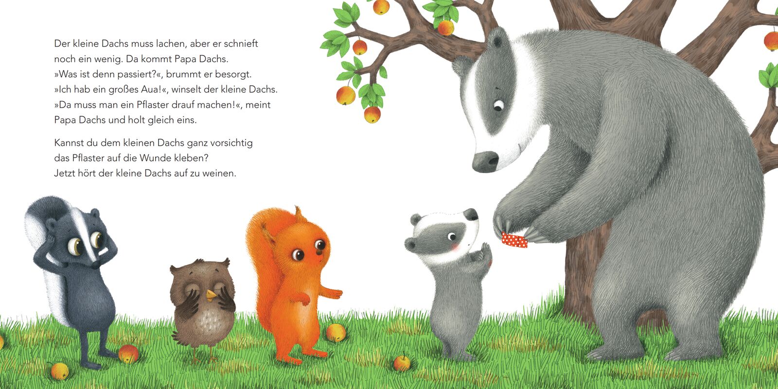 Ein liebevolles Trostbuch zum Mittrösten! Plumps, da sitzt der klein Dachs im Gras. Nur ein kleiner Kratzer, aber der Schreck ist groß. Schnell sind seine Freunde zur Stelle. Die kleine Eule streichelt den kleinen Dachs sanft, das Eichhörnchen pustet kräftig ...