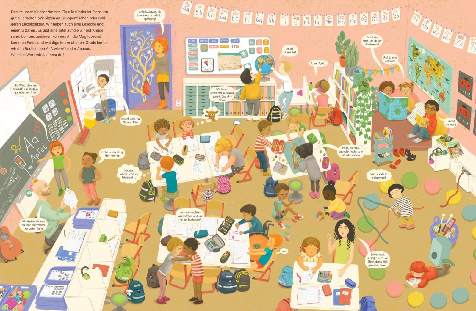 Ist es neugierig oder aufgeregt? Vielleicht voller Vorfreude, ungebändigtem Wissensdurst oder doch etwas bedrückt, gar ängstlich? Langweilt es sich, stresst es sich oder blüht es auf bei all den vielen kleinen und großen Erlebnissen im Schulalltag? Mit diesem Wimmelbuch kommst du mit deinem Kind ins Gespräch.