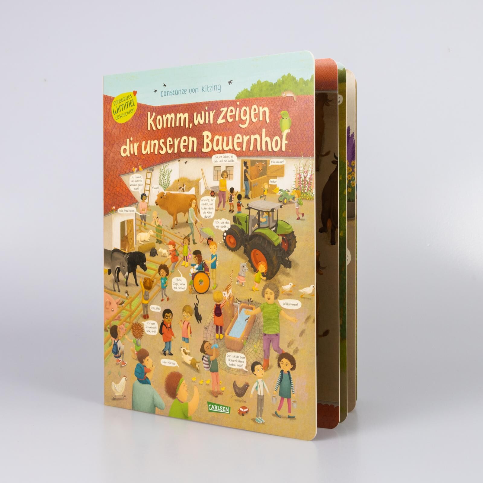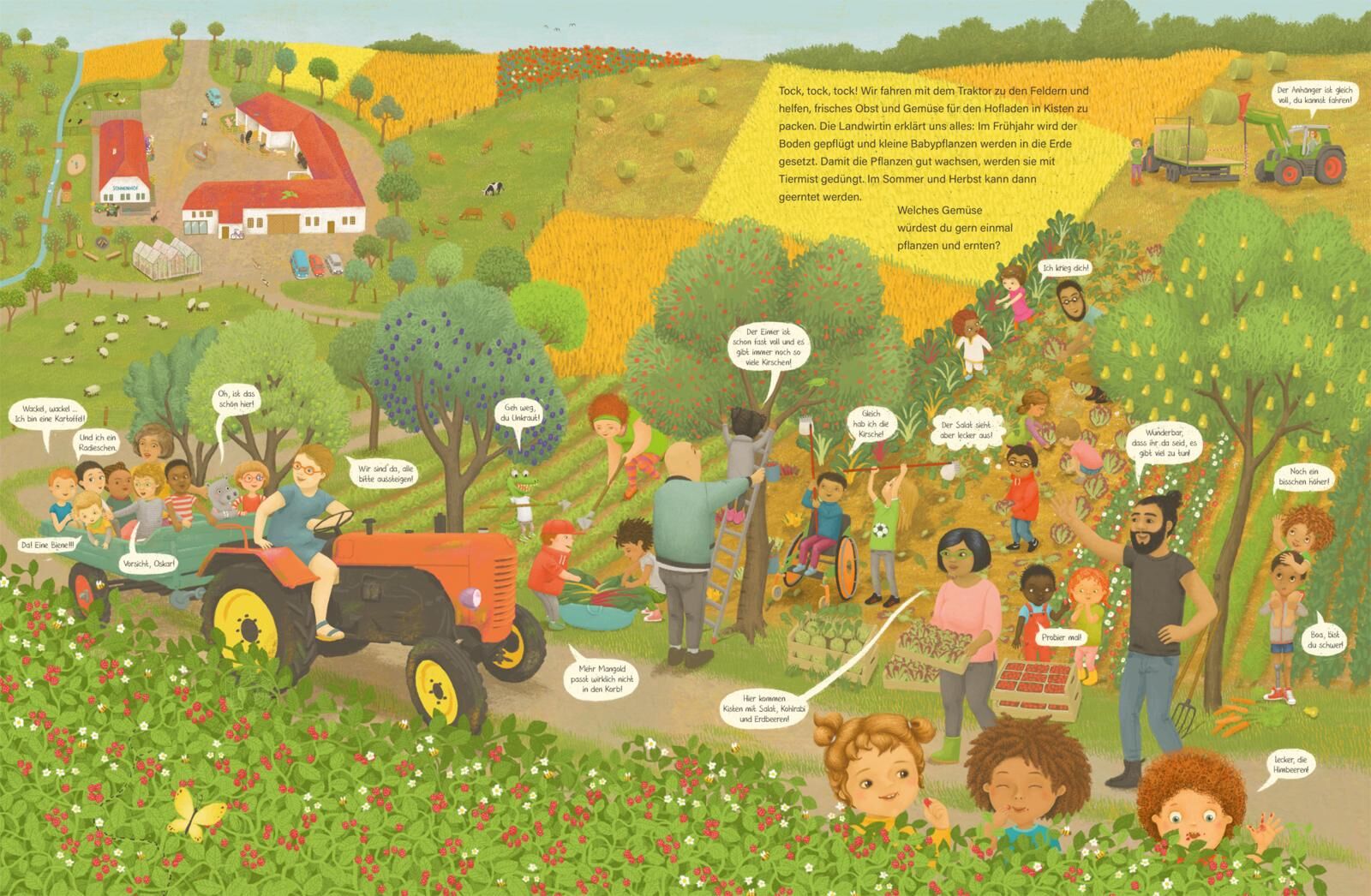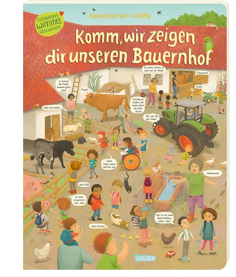 Hurra, heute macht die Pinguin-Gruppe der Kita Kunterbunt einen Ausflug zum Bauernhof. Was die Kinder dort wohl alles erleben? Sie begegnen den Hühnern, Schweinen, Kühen und vielen anderen Tieren. Sie dürfen mit dem Traktor zu den Feldern fahren und sogar tat...