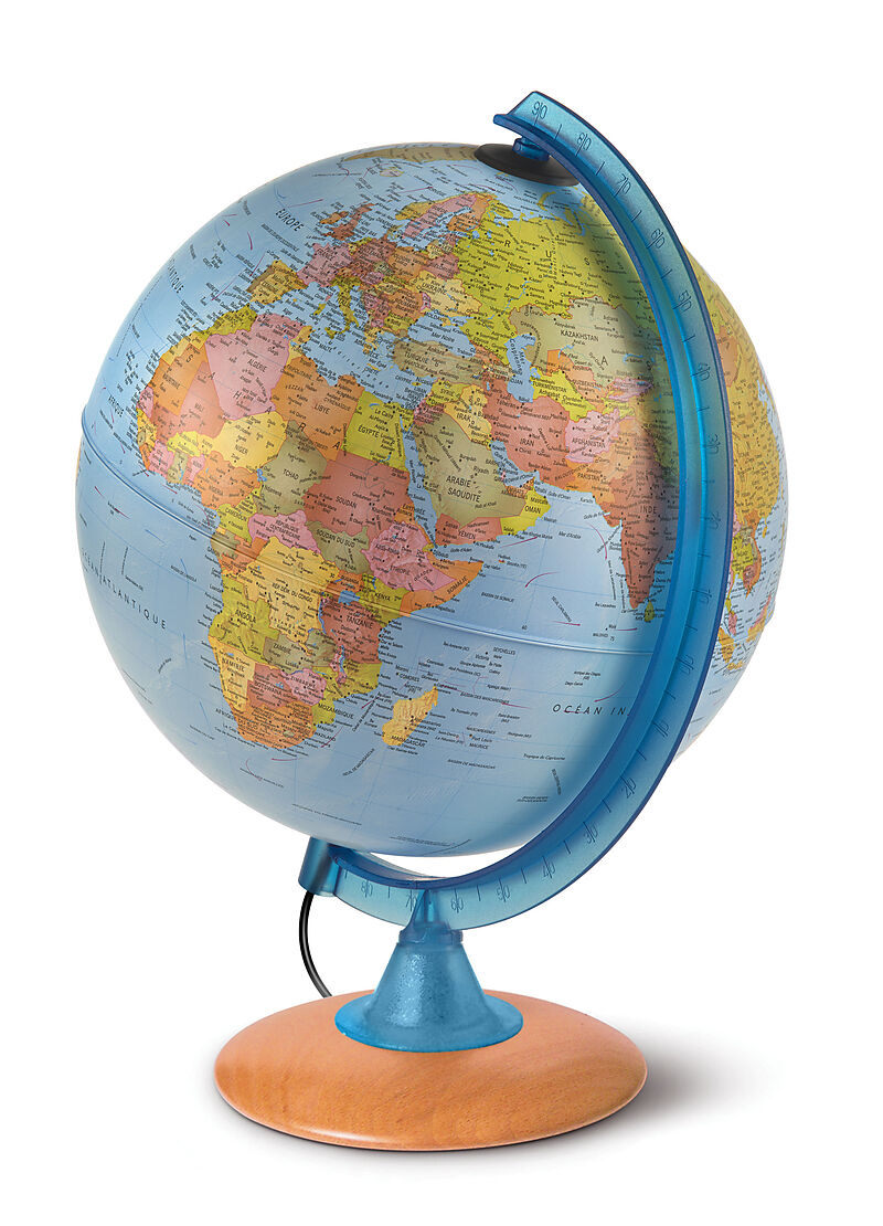 Constellation Plus, Doppelbildglobus phys./polit., 25 cm Durchm., blaue Kunststoffausstattung und heller Holzfuß, Download von Sternenbildern in Augmented Reality möglich, schwarze Zuleitung mit Schnurschalter