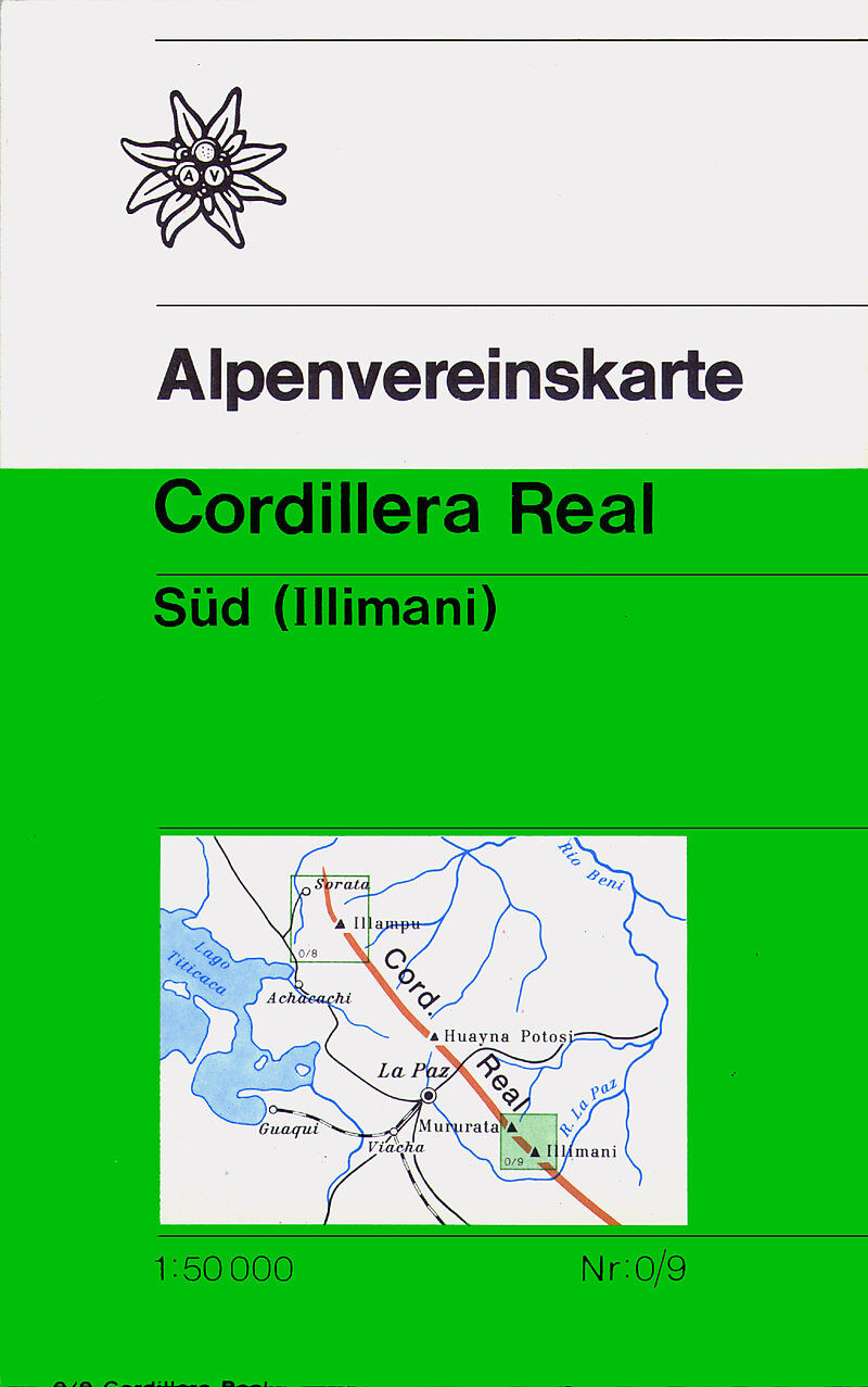 Topographische Karte 1:50.000 vom Gebiet der südlichen Cordillera Real in Bolivien, mehrfarbig, detailliert, mit Höhenlinien, Felsdarstellung, Schummerung.