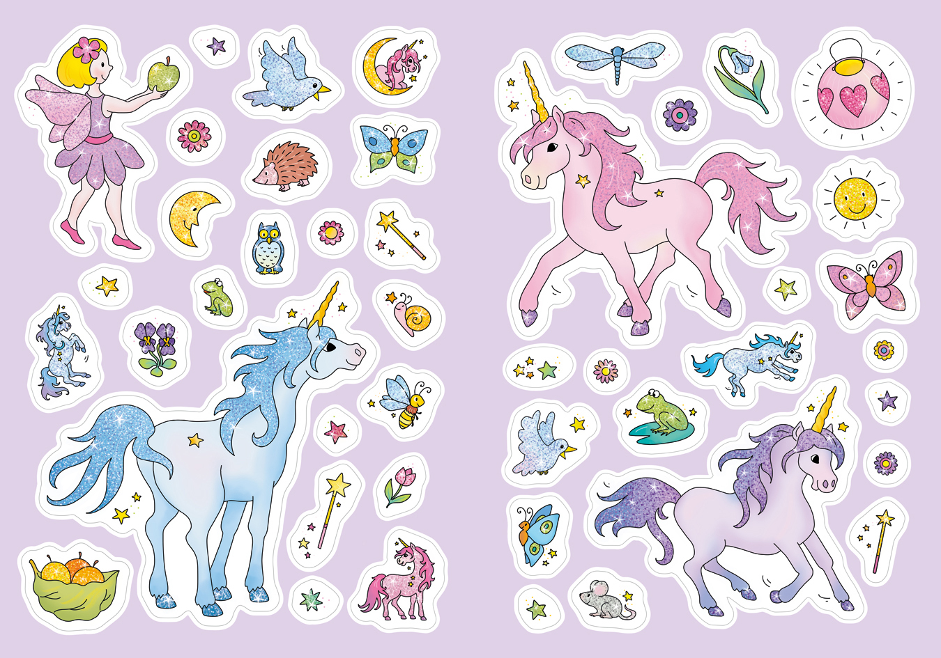 Zauberhafte Einhörner, süße Feen und viele niedliche Tiere zieren die Seiten des Malbuchs. Auf dem Regenbogen, unter dem Sternenhimmel oder plantschend im Wasser, die Einhörner und ihre Freunde liefern schöne Motive zum Ausmalen und Bekleben. 45 schöne Glitzer...