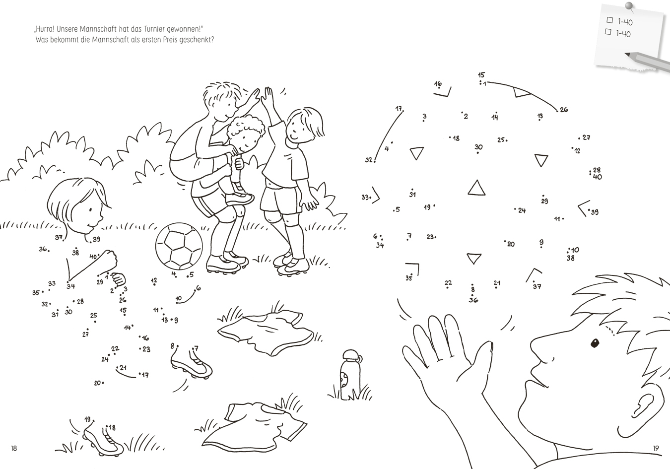Dribbelübung, Torschuss oder Spielfeldmarkierung in diesem tollen Beschäftigungsheft können Kinder eine Vielzahl an von Punkt zu Punkt Aufgaben durchführen. Jede der großen, teils farbigen Fußballszenen vom Aufwärmen über das Torwarttraining bis hin zur Taktik...
