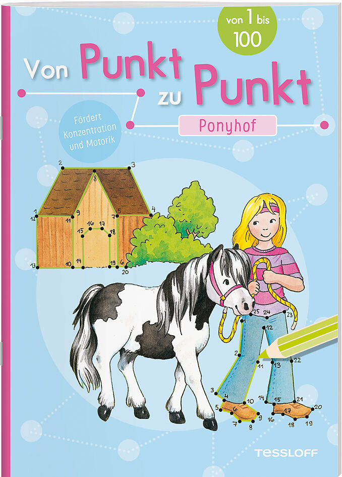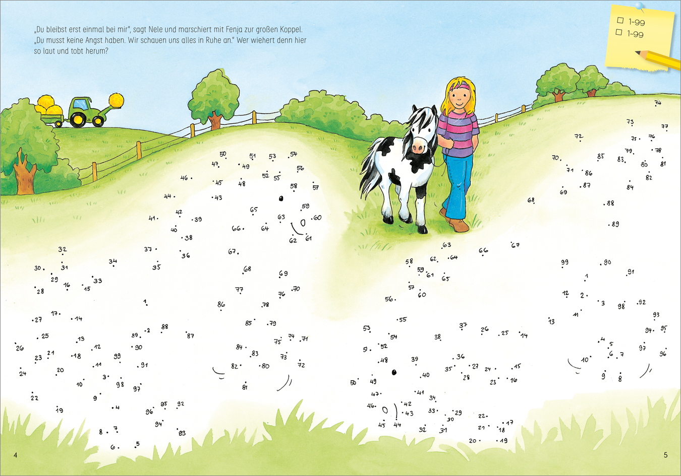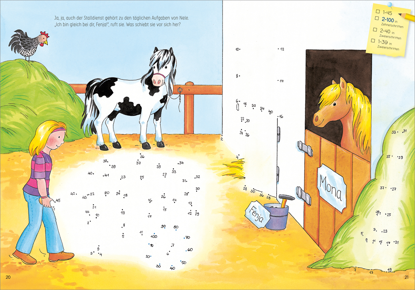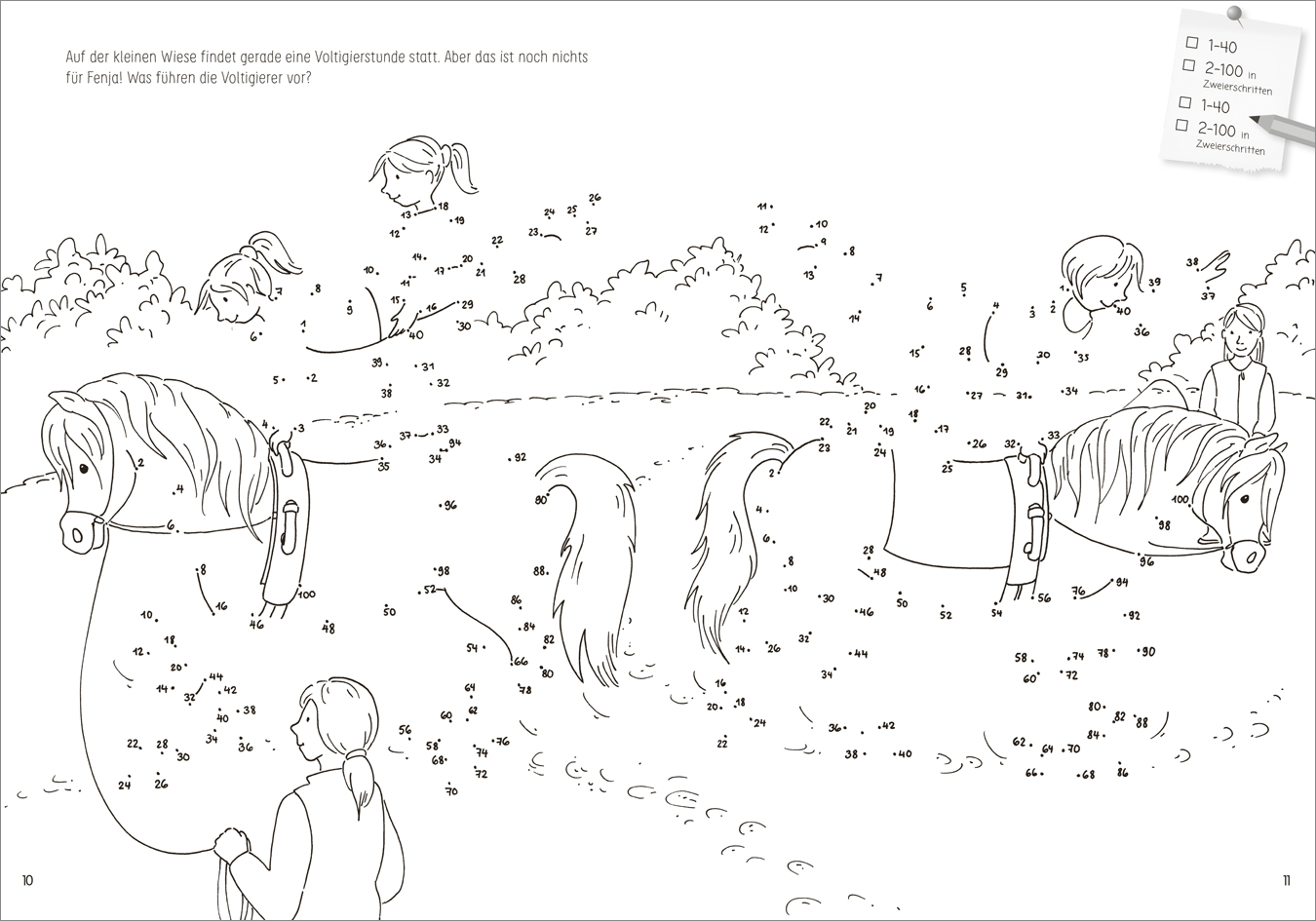 Dressurreiten, Stalldienst, Voltigierstunde auf dem Ponyhof ist jeden Tag was los. Um die schönen Szenen vollständig sichtbar zu machen, müssen die Kinder die Punkte von 1 bis 100 und von A bis Z einfach miteinander verbinden. Damit während des Malens keine La...