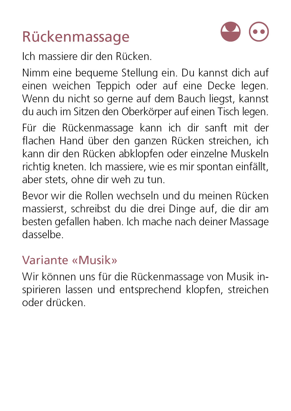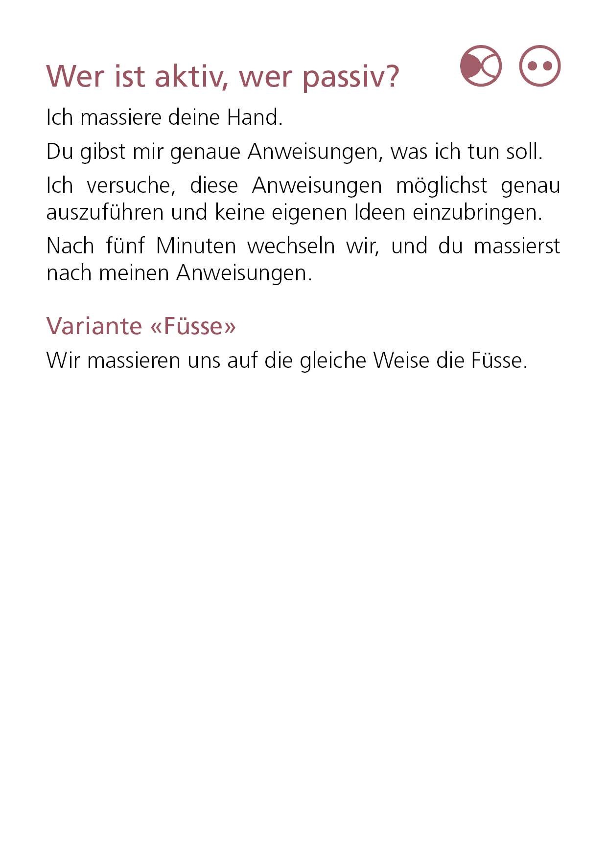«bitte berühren» besteht aus 24 Spielkarten mit sechs Themen, die jeweils mit einem Symbol angezeigt werden: Berühren, Handlungsweise, Spüren, Eigenwahrnehmung, Spiel, Grenzen. Die Einordnung dieser sechs Themen erfolgt im Begleittext. Auf einer Zusatzkarte si...