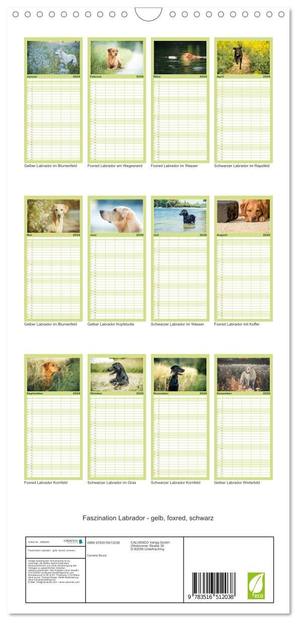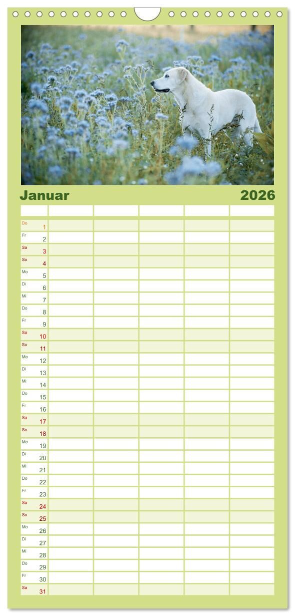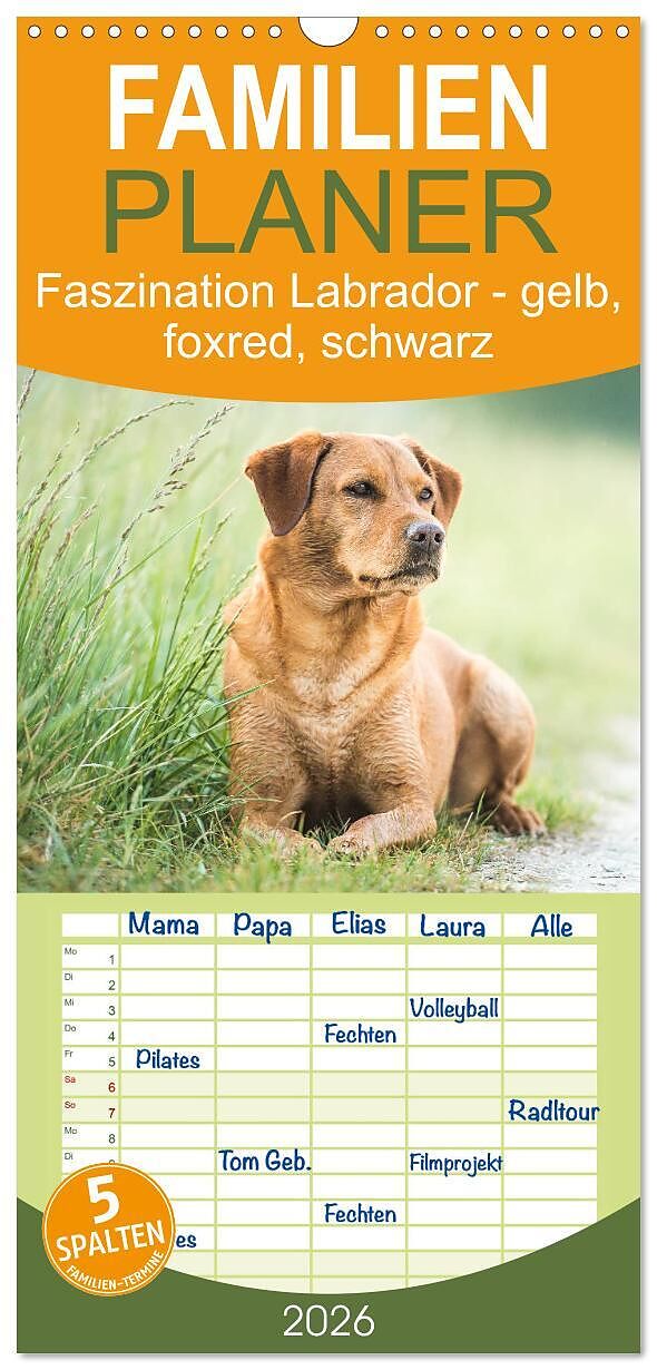 Familienplaner 2026 - Faszination Labrador - gelb, foxred, schwarz mit 5 Spalten (Wandkalender, 21 x 45 cm) CALVENDO