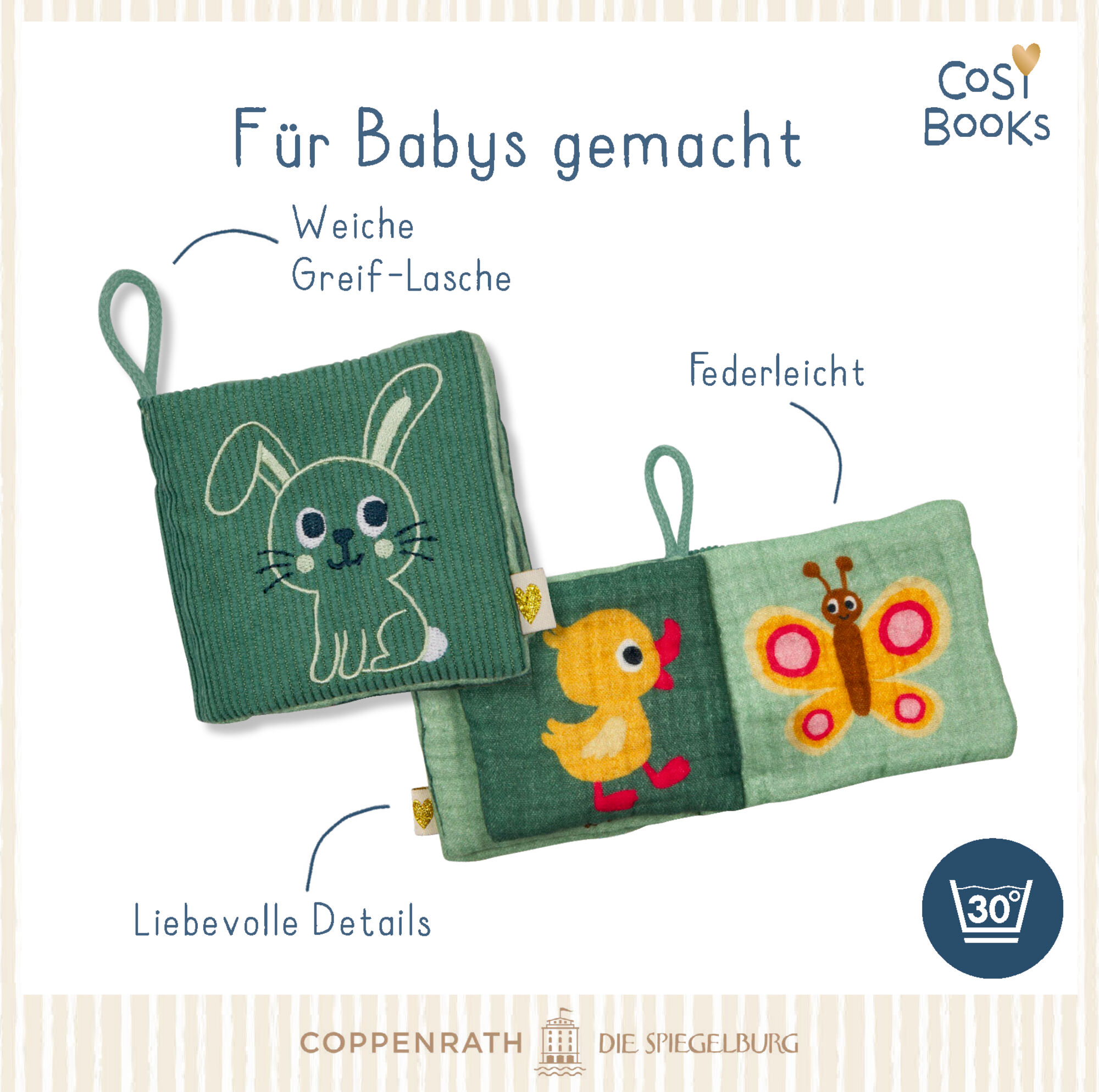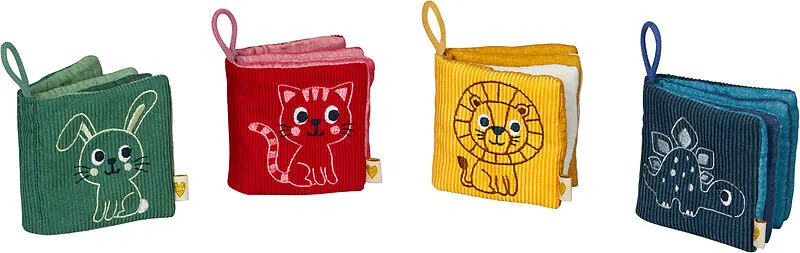 Mini-Stoffbücher für Babys Vier Stoffbücher mit Tiermotiven Kuschelweicher Cord-Einband in vier Designs: Löwe, Katze, Dino und Hase Kontrastreiche Musselin-Seiten fördern die visuelle Wahrnehmung Babyfreundlich und praktisch: Waschbar bei 30 °C mit Aufhängung ...