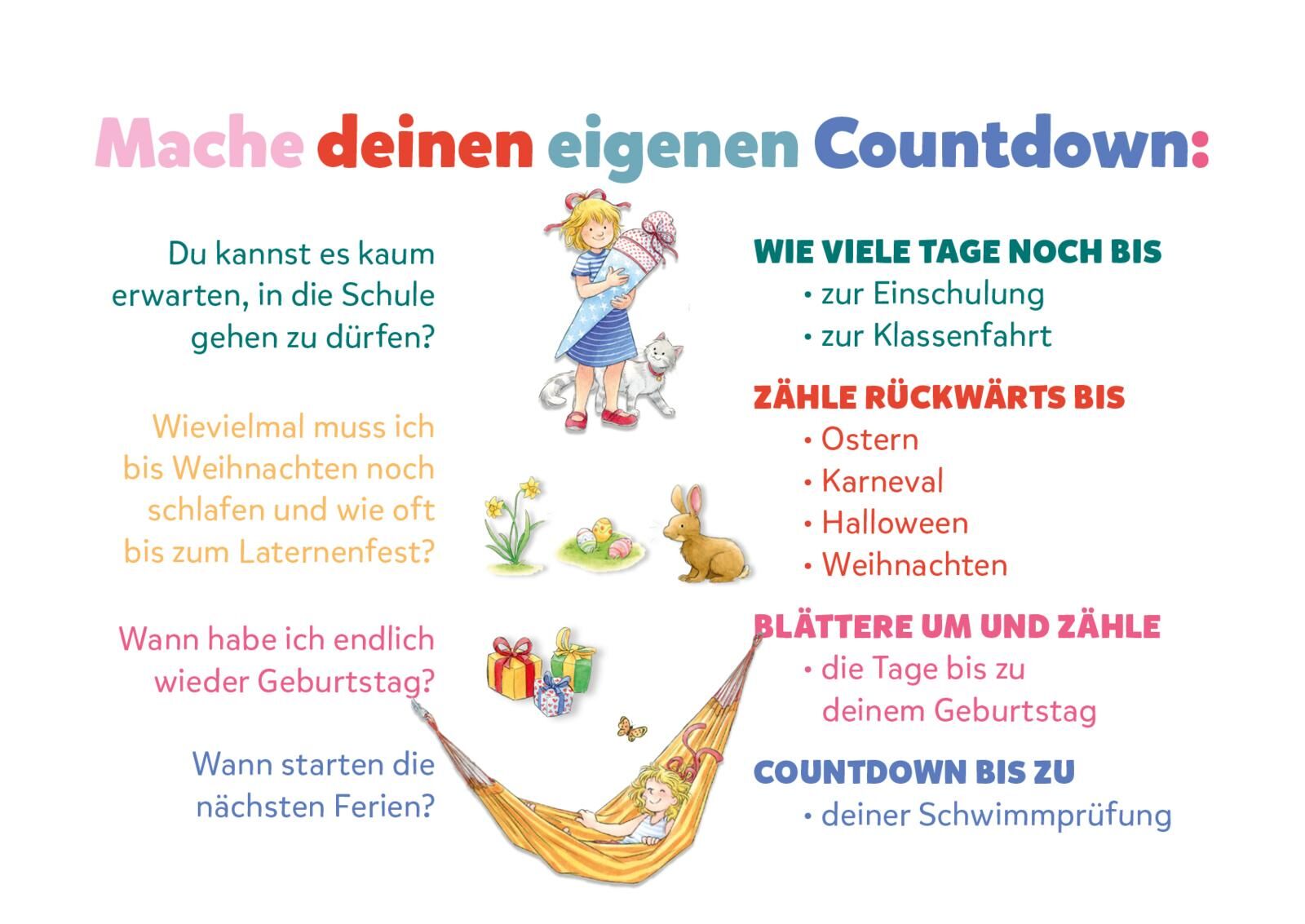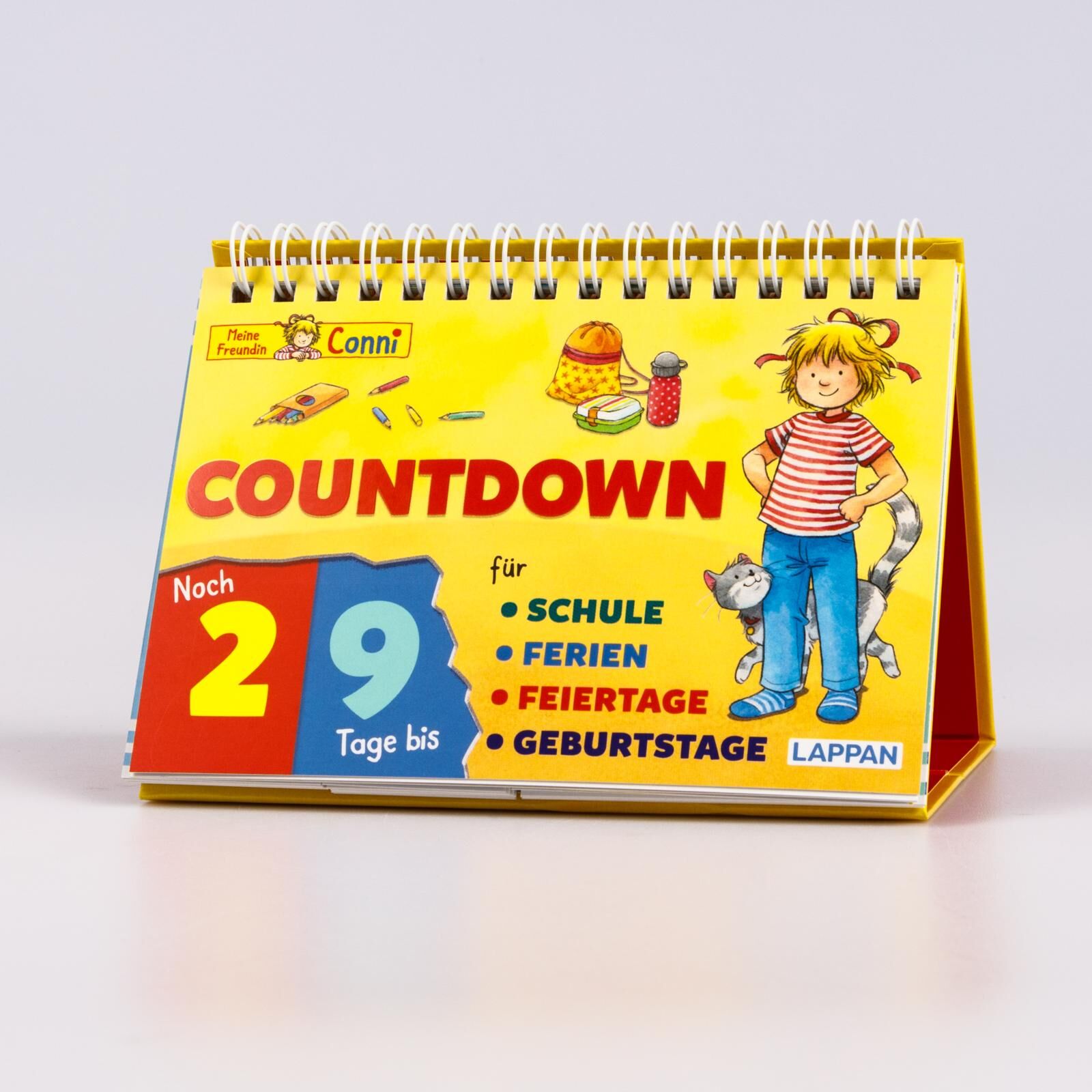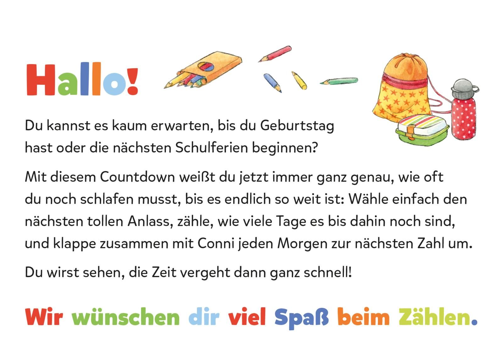 Mit Conni durch das Schuljahr! Dieser Countdown-Aufsteller mit Conni begleitet euch durch das ganze Schuljahr! Jeden Tag könnt ihr eine Seite weiterblättern und so die Vorfreude auf euren Wunschtermin genießen. Wählen Sie zusammen mit Ihrem Kind immer wieder d...