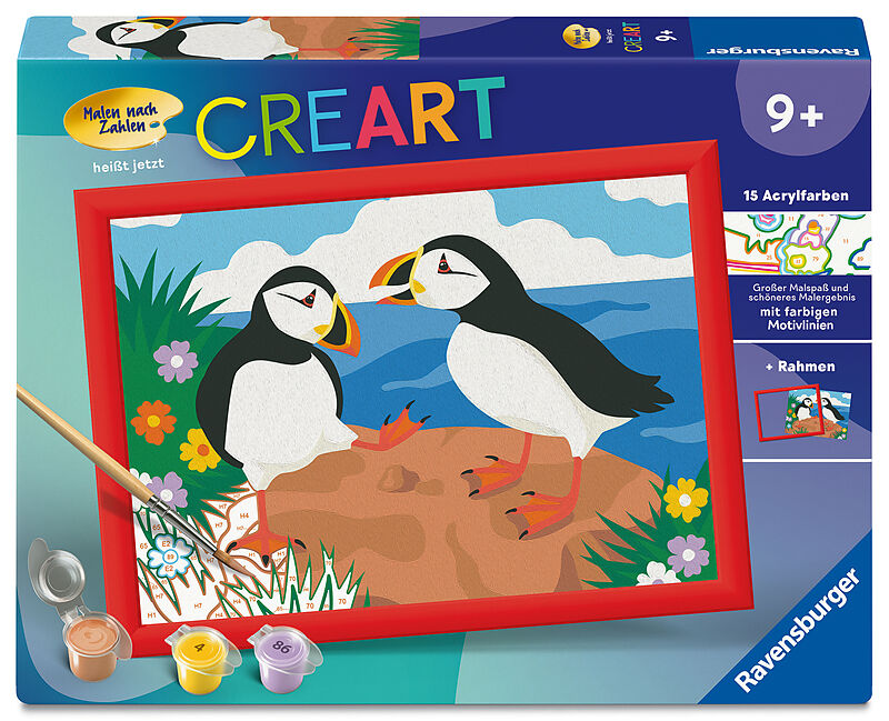 Farbige Motivlinien: Größerer Malspaß & ein schöneres Ergebnis! Dank der farbigen Motivlinien, können die Kinder das ganze Motiv Papageientaucher und die Farben schneller erkennen. Der Pinsel hat eine gute Führung und so entsteht ein perfektes Bild. Die sc...