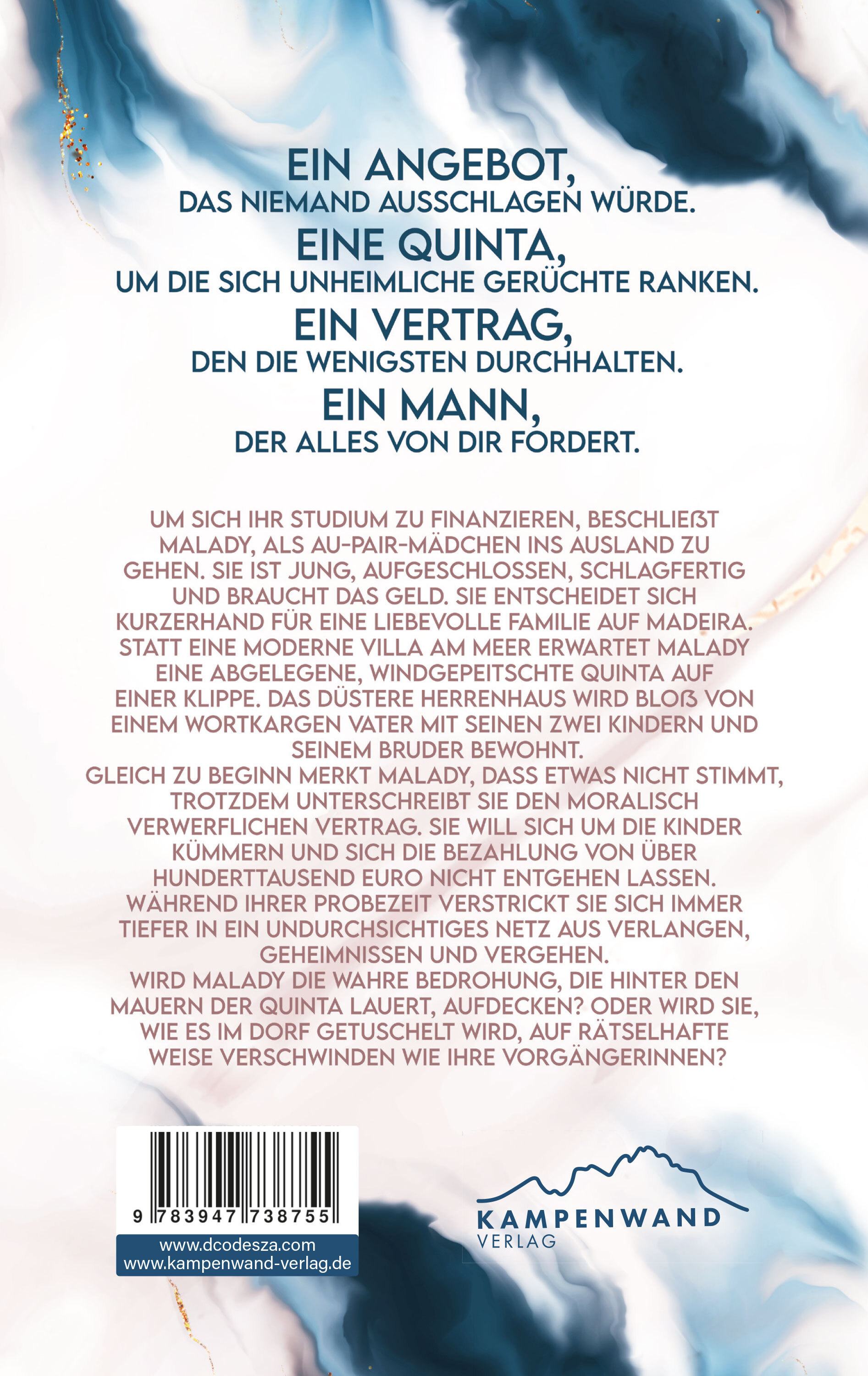 Ein Angebot, das niemand ausschlagen würde. Eine Quinta, um die sich unheimliche Gerüchte ranken. Ein Vertrag, den die wenigsten durchhalten. Ein Mann, der alles von dir fordert. Um sich ihr Studium zu finanzieren und für die Arztkosten ihres Bruders zu sparen...