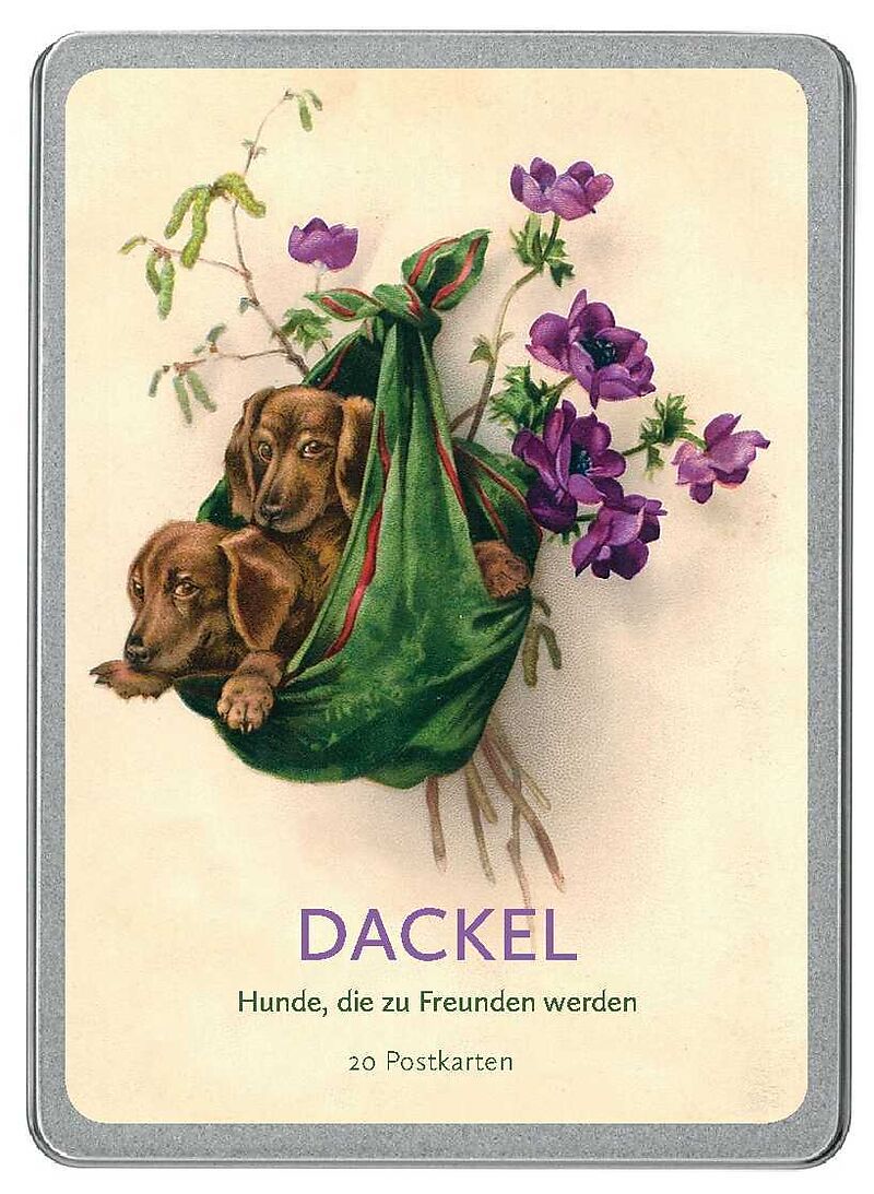 20 Postkarten gedruckt auf Apfelpapier in einer hochwertigen Dose: Ihre Besitzerinnen sind davon überzeugt: Dackel sind die charmantesten Hunde, treu und ohne Arg. Bilder mit liebevollen, skurrilen, übermütigen Illustrationen des neunzehnten Jahrhunderts.