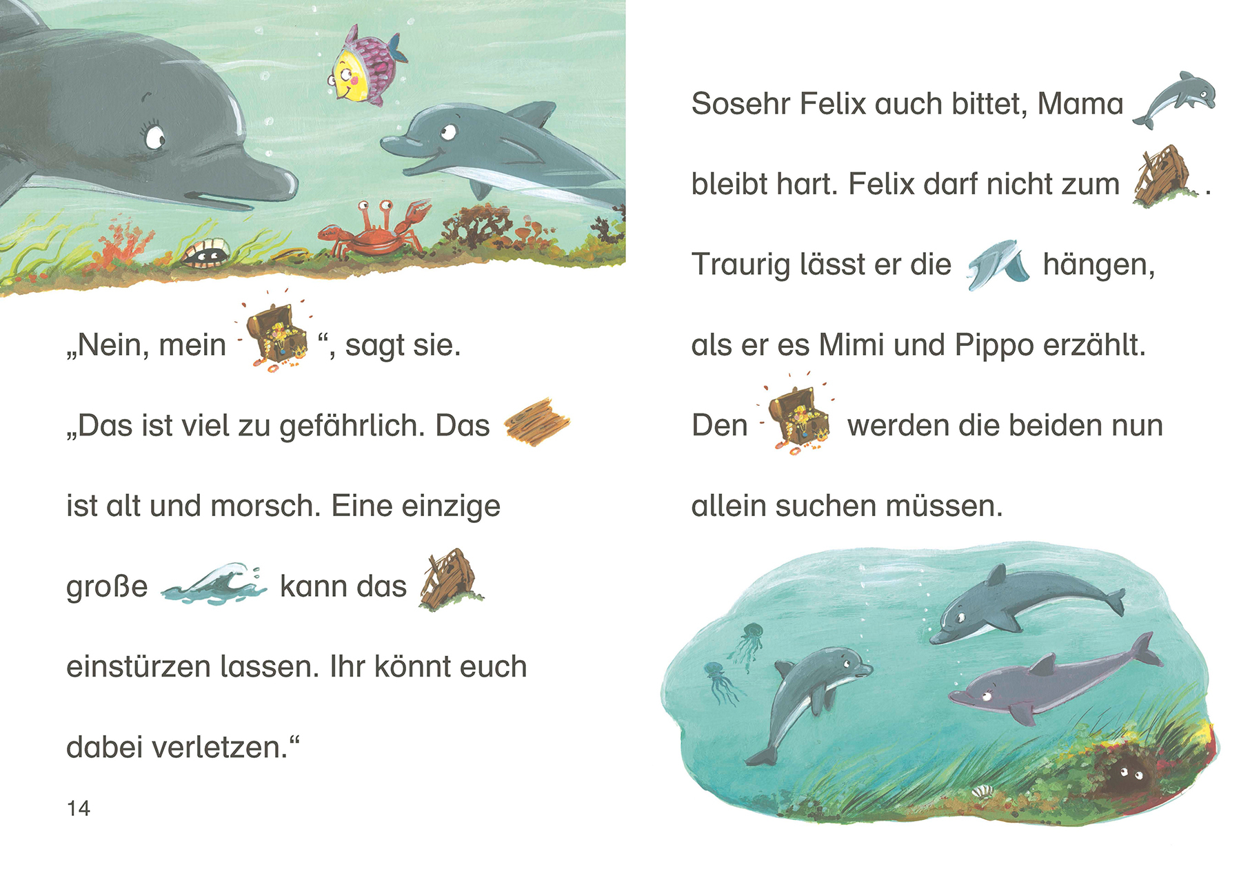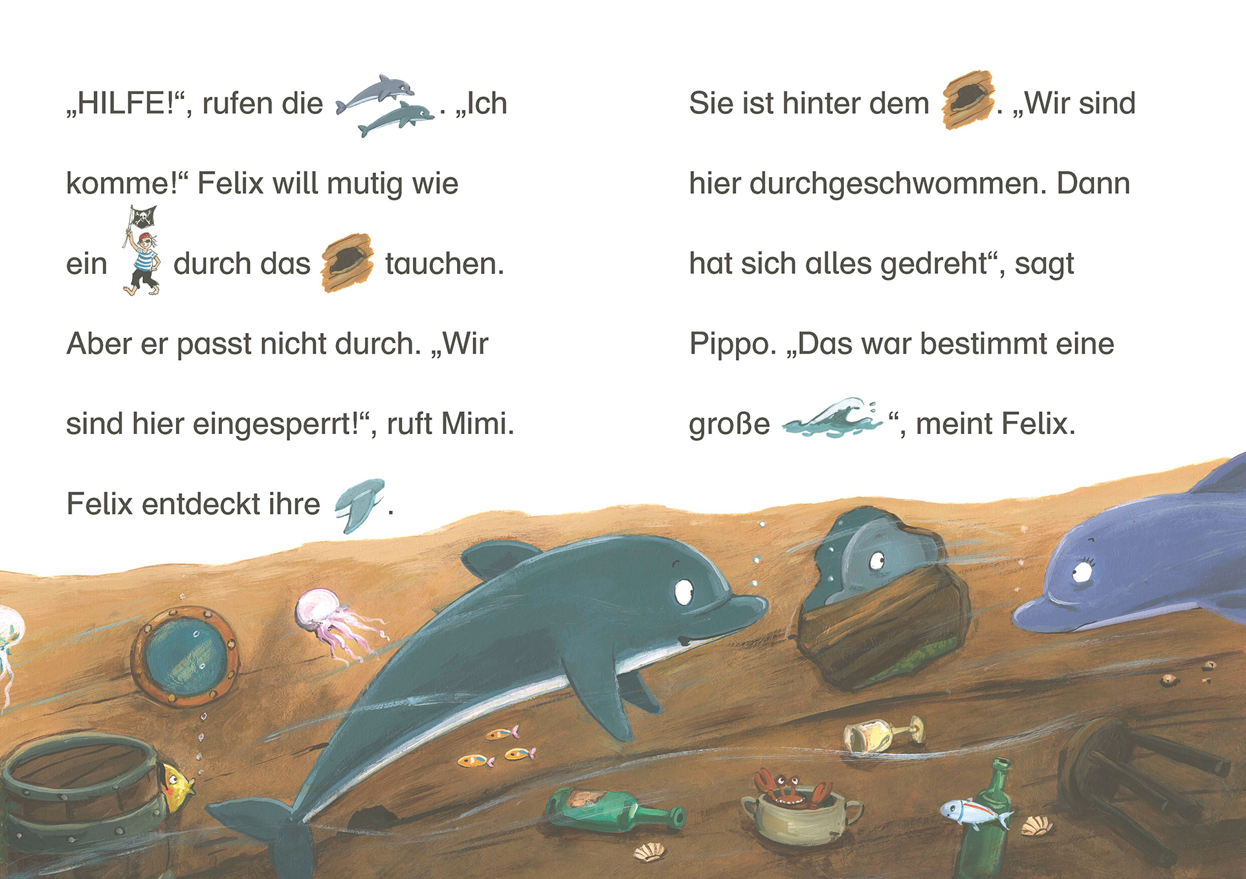 Der kleine Delfin Felix ist traurig. Seine Freunde suchen einen geheimen Schatz, aber er darf nicht mitkommen. Doch dann geraten die Delfine in Gefahr und nur Felix kann ihnen helfen Mit der Reihe Bildermaus können Kinder schon ab 5 Jahren (Vorschule) spieleri...