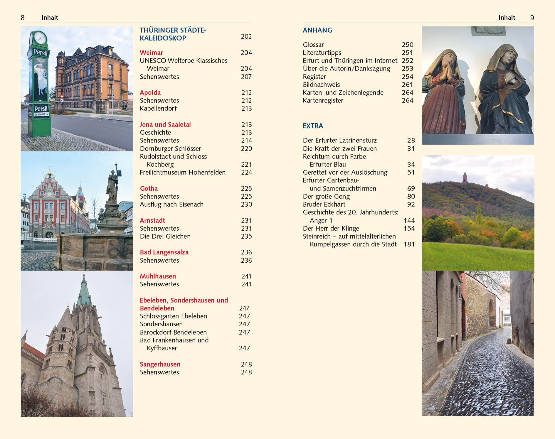 Seite 52 DIE STADTKRONE Dom St. Marien, Severi- und Peterskirche > Seite 75 SCHMUCKSTÜCK AUS DEM 15. JAHRHUNDERT Die Krämerbrücke > Seite 122 KOSTBARKEITEN IN DER ALTEN SYNAGOGE Der Erfurter Schatz > Seite 130 DER WEG DER GERA DURCH DIE STADT Geschichte(n) am Wasser > Seite 145 GASSEN, WINKEL, ALTE SPEICHER Erfurts Altstadt > Seite 157 FESTUNGEN ZU BLÜHWIESEN Petersberg und egapark > Seite 161 WO GOETHE UND SCHILLER WIRKTEN UNESCO-Welterbe Klassisches Weimar > Seite 204 Erfurt, die Stadt im Herzen Deutschlands, lockt mit mittelalterlichen Kirchen und liebevoll sanierten Fachwerk- und Bürgerhäusern zahlreiche Besucher an. Höhepunkte eines Stadtrundgangs sind die berühmte Krämerbrücke mit originellen Läden und Cafés, der Domberg mit dem Dom St. Marien und der Severikirche sowie der Fischmarkt mit seinen Renaissancefassaden. Auch abseits der bekannten Sehenswürdigkeiten gibt es an den Wasserarmen der Gera und in verwinkelten Gässchen viel zu entdecken. Mit der Ausrichtung der Bundesgartenschau 2021 besann sich Erfurt seiner Gartenbautraditionen, Petersberg und egapark erblühen in neuem Glanz. Dieser Reiseführer stellt auf detaillierten Rundgängen alle Sehenswürdigkeiten vor, die bekannten und die weniger bekannten Orte. Umfangreiche Tipps zu Unterkunft, Einkehr, Museen und Veranstaltungen helfen bei der Vorbereitung einer Reise in die thüringische Landeshauptstadt. Ausflugskapitel führen in nahegelegene Städte wie Weimar, Jena oder Arnstadt mit ihren zahlreichen Kulturdenkmalen. >>> Weitere Reiseführer zu interessanten Regionen in Deutschland finden Sie auf der Website des Trescher Verlags.Inhalt