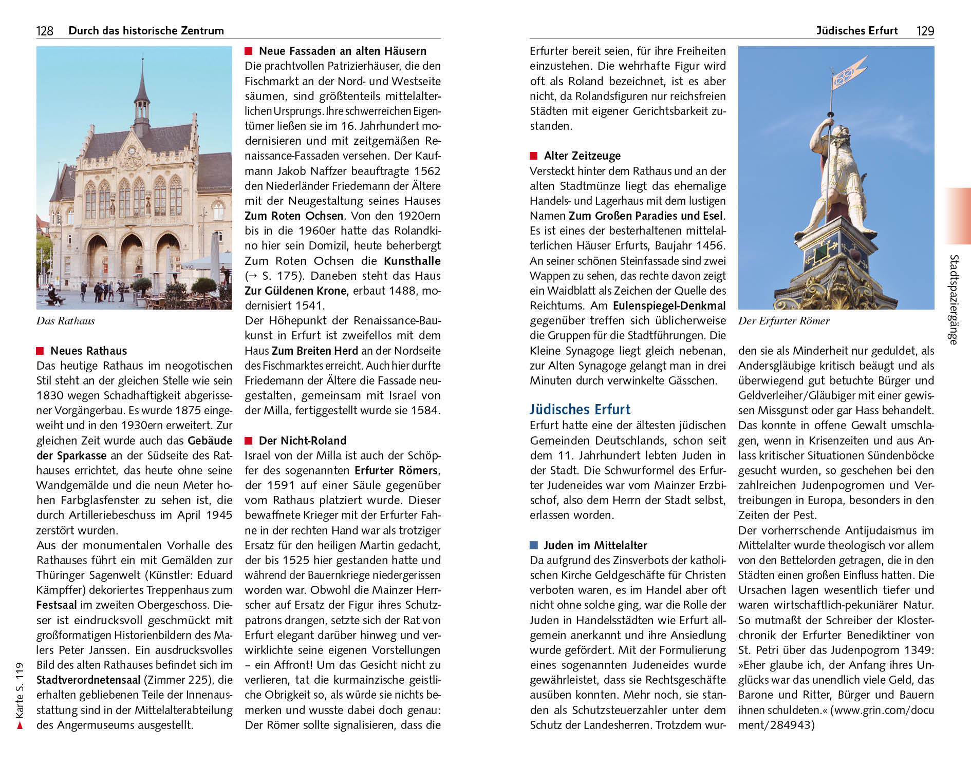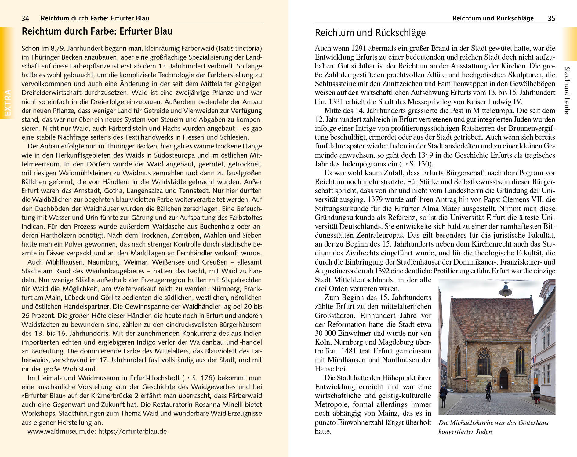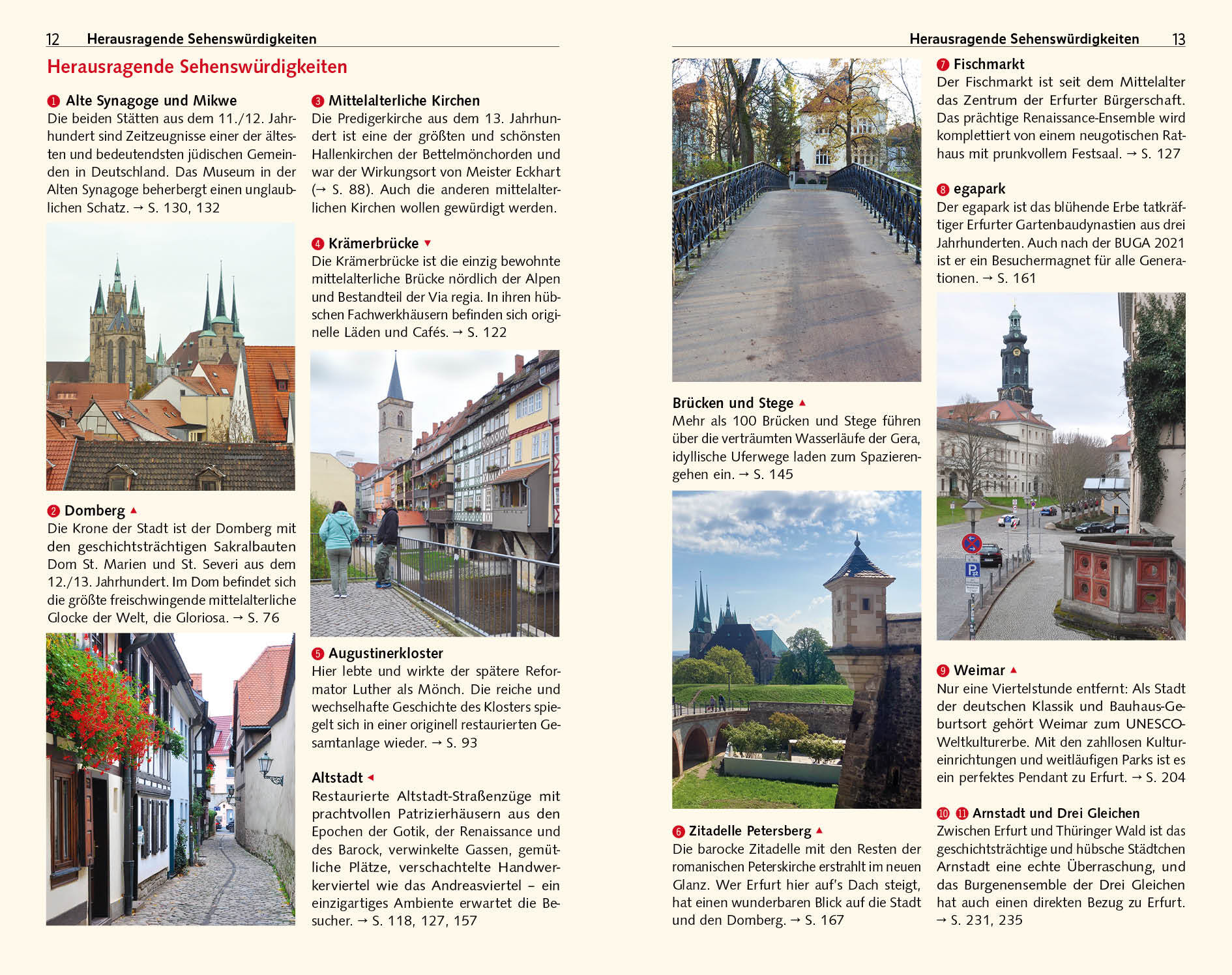 Seite 52 DIE STADTKRONE Dom St. Marien, Severi- und Peterskirche > Seite 75 SCHMUCKSTÜCK AUS DEM 15. JAHRHUNDERT Die Krämerbrücke > Seite 122 KOSTBARKEITEN IN DER ALTEN SYNAGOGE Der Erfurter Schatz > Seite 130 DER WEG DER GERA DURCH DIE STADT Geschichte(n) am Wasser > Seite 145 GASSEN, WINKEL, ALTE SPEICHER Erfurts Altstadt > Seite 157 FESTUNGEN ZU BLÜHWIESEN Petersberg und egapark > Seite 161 WO GOETHE UND SCHILLER WIRKTEN UNESCO-Welterbe Klassisches Weimar > Seite 204 Erfurt, die Stadt im Herzen Deutschlands, lockt mit mittelalterlichen Kirchen und liebevoll sanierten Fachwerk- und Bürgerhäusern zahlreiche Besucher an. Höhepunkte eines Stadtrundgangs sind die berühmte Krämerbrücke mit originellen Läden und Cafés, der Domberg mit dem Dom St. Marien und der Severikirche sowie der Fischmarkt mit seinen Renaissancefassaden. Auch abseits der bekannten Sehenswürdigkeiten gibt es an den Wasserarmen der Gera und in verwinkelten Gässchen viel zu entdecken. Mit der Ausrichtung der Bundesgartenschau 2021 besann sich Erfurt seiner Gartenbautraditionen, Petersberg und egapark erblühen in neuem Glanz. Dieser Reiseführer stellt auf detaillierten Rundgängen alle Sehenswürdigkeiten vor, die bekannten und die weniger bekannten Orte. Umfangreiche Tipps zu Unterkunft, Einkehr, Museen und Veranstaltungen helfen bei der Vorbereitung einer Reise in die thüringische Landeshauptstadt. Ausflugskapitel führen in nahegelegene Städte wie Weimar, Jena oder Arnstadt mit ihren zahlreichen Kulturdenkmalen. >>> Weitere Reiseführer zu interessanten Regionen in Deutschland finden Sie auf der Website des Trescher Verlags.Inhalt
