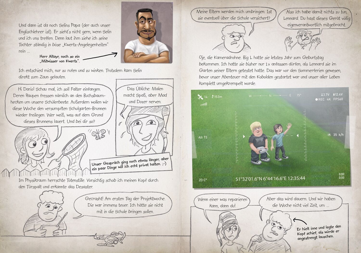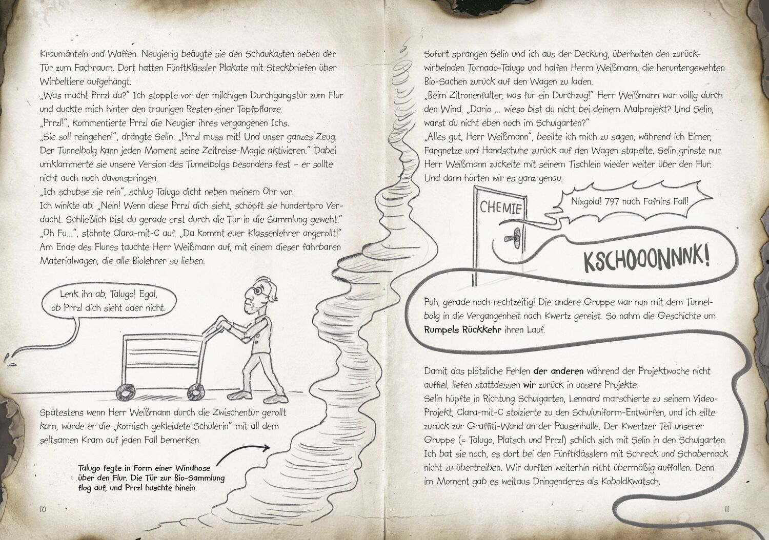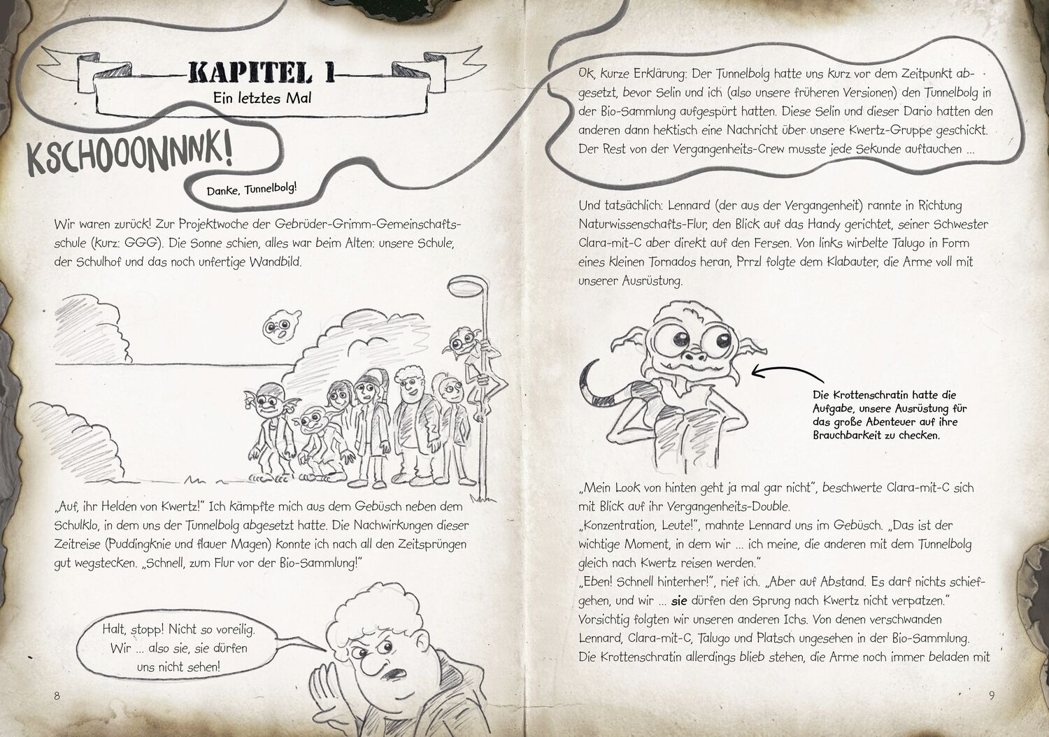 Es ist soweit: Es geht um die Rettung der Welt! Denn niemand Geringerer als die machthungrige Koboldprinzessin Azzrar lässt einen Drachen auf Kobolde und Menschen los. Krottenschrate kämpfen gegen Lehrer, das Chaos regiert ... Mooooooment. Passiert das wirklich? Oder ist es der Blick in eine düstere Zukunft, den Dario, Rumpel und ihre Abenteuergruppe an der Schule werfen? Mit Zeitreisen kennen sie sich ja mittlerweile aus und der silbrig-wuselnde Tunnelbolg ist aktiv wie nie zuvor...