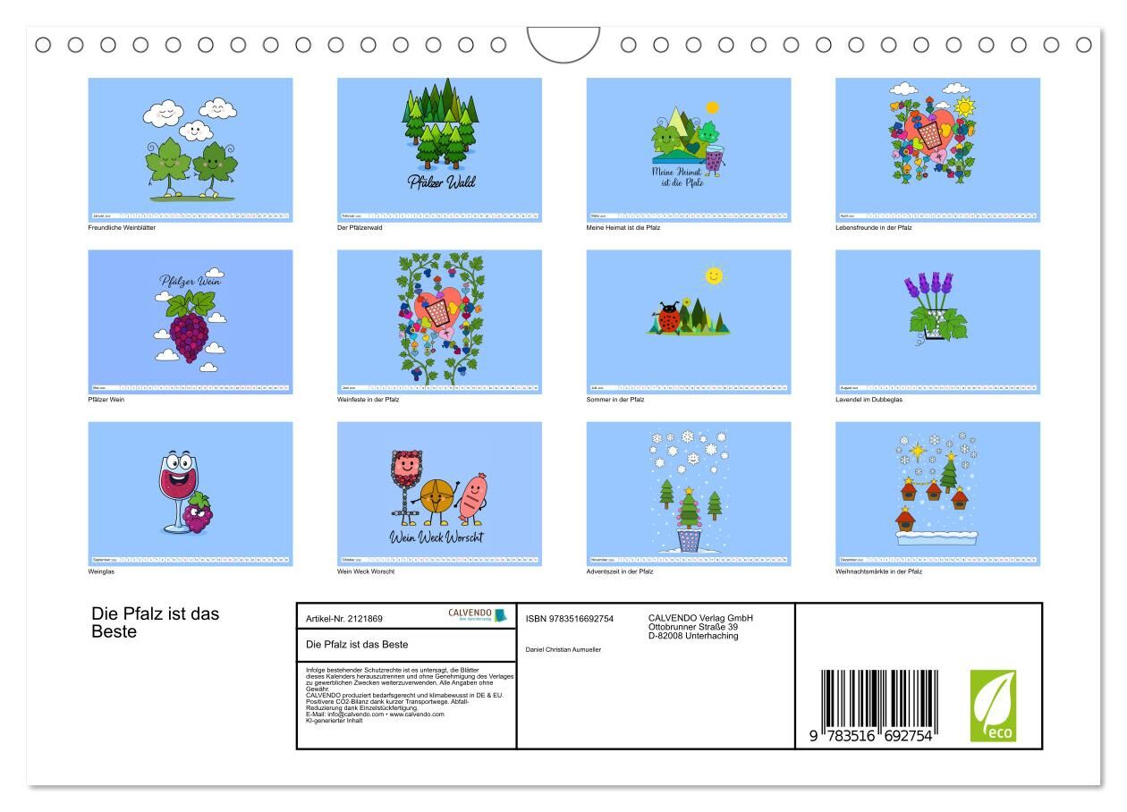 Die Pfalz ist schön und jetzt auch als Cartoon! Erlebe die Vielfalt der Pfalz in einem fröhlichen Kalender, der Weinberge, Tannenwälder und das bunte Leben in lustigen Cartoon-Bildern zum Strahlen bringt. Ob fröhliche Trauben, tanzende Marienkäfer oder die san...