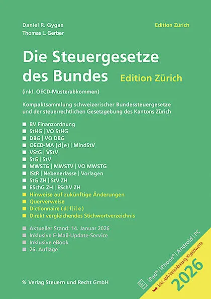 Das Gesetz ist die wichtigste Quelle für die Beantwortung steuerrechtlicher Fragen. +++ Im vorliegenden Werk «Die Steuergesetze des Bundes Edition Zürich 2026» (Stand: 15. Januar 2026) sind alle relevanten schweizerischen Bundessteuergesetze und -verordnungen ...