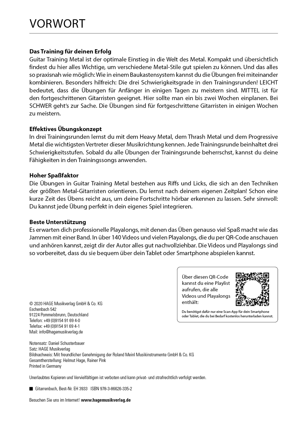 DAS TRAINING FÜR DEINEN ERFOLG Guitar Training Metal ist der optimale Einstieg in die Welt des Metal. Kompakt und ubersichtlich findest du hier alles Wichtige, um verschiedene Metal-Stile gut spielen zu können. Und das alles so praxisnah wie möglich: Wie in ei...DAS TRAINING FÜR DEINEN ERFOLG Guitar Training Metal ist der optimale Einstieg in die Welt des Metal. Kompakt und ubersichtlich findest du hier alles Wichtige, um verschiedene Metal-Stile gut spielen zu können. Und das alles so praxisnah wie möglich: Wie in einem Baukastensystem kannst du die Übungen frei miteinander kombinieren. Besonders hilfreich: Die drei Schwierigkeitsgrade in den Trainingsrunden! LEICHT bedeutet, dass die Übungen fur Anfänger in einigen Tagen zu meistern sind. MITTEL ist fur den fortgeschrittenen Gitarristen geeignet. Hier sollte man ein bis zwei Wochen einplanen. Bei SCHWER geht's zur Sache. Die Übungen sind fur fortgeschrittene Gitarristen in einigen Wochen zu meistern. EFFEKTIVES ÜBUNGSKONZEPT In drei Trainingsrunden lernst du mit dem Heavy Metal, dem Thrash Metal und dem Progressive Metal die wichtigsten Vertreter dieser Musikrichtung kennen. Jede Trainingsrunde beinhaltet drei Schwierigkeitsstufen. Sobald du alle Übungen der Trainingsrunde beherrschst, kannst du deine Fähigkeiten in den Trainingssongs anwenden. HOHER SPASSFAKTOR Die Übungen in Guitar Training Metal bestehen aus Riffs und Licks, die sich an den Techniken der größten Metal-Gitarristen orientieren. Du lernst nach deinem eigenen Zeitplan! Schon eine kurze Zeit des Übens reicht aus, um deine Fortschritte hörbar erkennen zu lassen. Sehr sinnvoll: Du kannst jede Übung perfekt in dein eigenes Spiel integrieren. BESTE UNTERSTÜTZUNG Es erwarten dich professionelle Playalongs, mit denen das Üben genauso viel Spaß macht wie das Jammen mit einer Band. In uber 140 Videos und vielen Playalongs, die du per QR-Code anschauen und anhören kannst, zeigt dir der Autor alles gut nachvollziehbar. Die Videos und Playalongs sind so vorbereitet, dass du sie bequem uber dein Tablet oder Smartphone abspielen kannst.