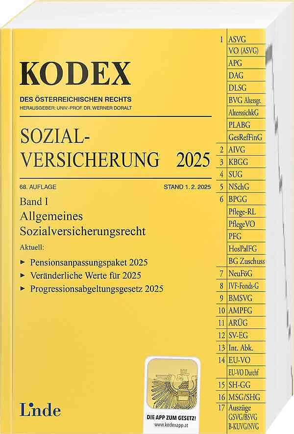 Auflage, Stand 1.2.2025Mit der App zum GesetzBand I: Allgemeines SozialversicherungsrechtAktuell:Pensionsanpassungspaket 2025Veränderliche Werte für 2025Progressionsabgeltungsgesetz 2025 KODEX Sozialversicherung 2025, Band I68. Auflage, Stand 1.2.2025Mit d...