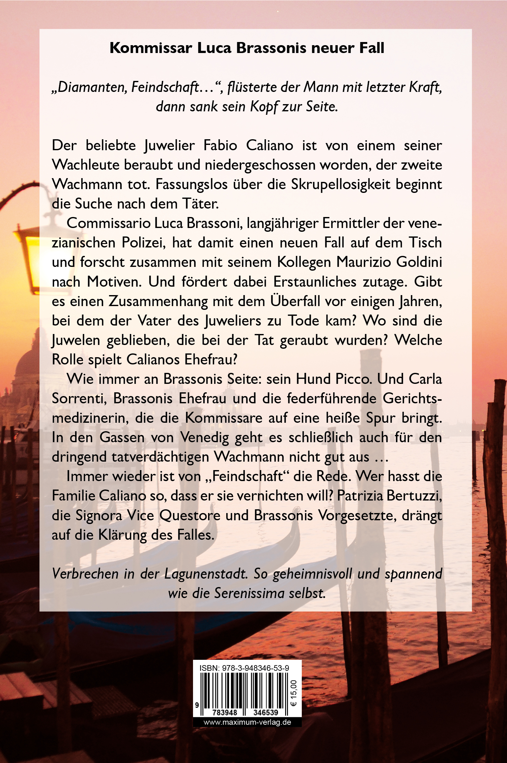 Kommissar Luca Brassonis neuer Fall "Diamanten, Feindschaft...", flüsterte der Mann mit letzter Kraft, dann sank sein Kopf zur Seite. Ein strenger Wind weht schon seit Tagen über die Lagunenstadt. Lose Fensterläden klappern im eisigen Zug der orkanartigen Böen...