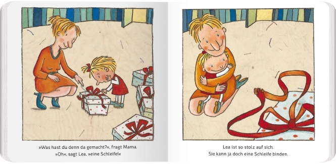 Mit der lustigen Bilderbuchgeschichte von Lea und den Schnürsenkeln am Buch macht das Schleife binden lernen einfach großen Spaß! Mama hat Lea was mitgebracht: rote Schuhe! Die Schuhe sind wunderschön, aber sie haben Schleifen. Und Lea kann doch noch keine Sch...
