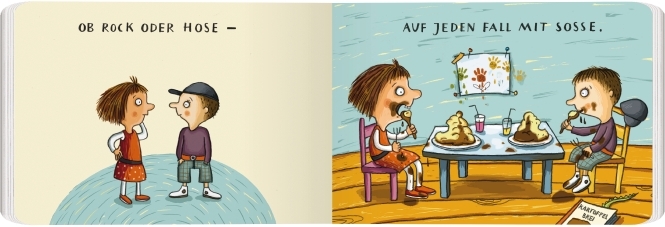 Ein erstes Pappbilderbuch über Freundschaft, Toleranz und Zusammenhalt, mit frechen Versen und fröhlichen Illustrationen. Ob klein oder groß, beiden schmeckt der Kloß. Ob traurig oder froh, jeder muss aufs Klo. Ob alt oder jung, auf jeden Fall mit Schwung. Gan...