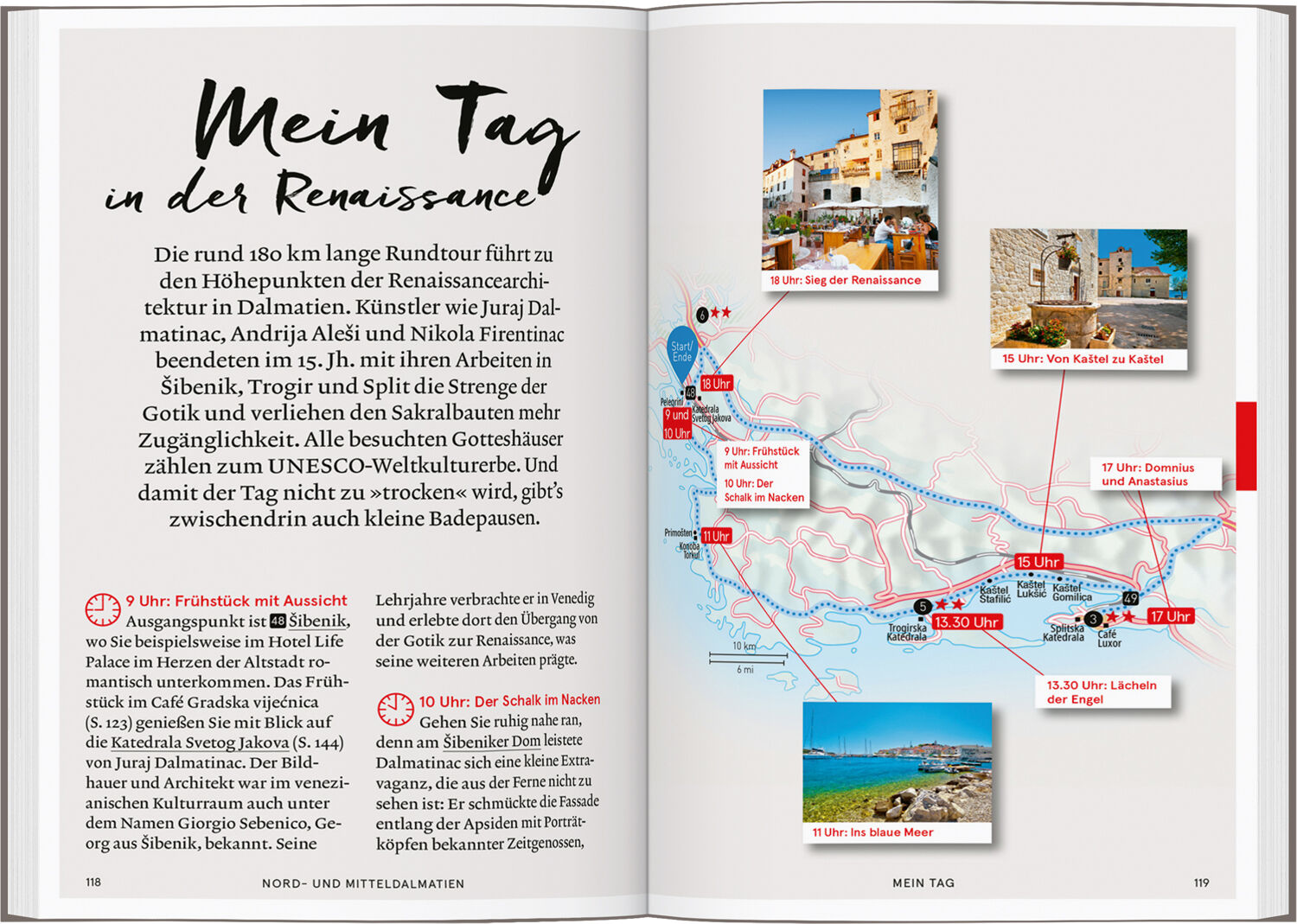 Als wenn er genau wüsste, was Ihnen gefällt planen Sie morgens schnell und einfach den Tag mit dem Baedeker SMART Kroatien Reiseführer. Verbringen Sie doch einen Tag in Istrien und erleben Sie die beeindruckende Altstadt von Pore. Entspannung verspricht die idyllische Hafenstadt Pula, wohingegen Rovinj mit seiner lebendigen Stadtgeschichte, einer Vielzahl an Kirchen und zauberhafter Kunst kulturelle Einblicke bietet. Oder zieht es Sie in die Natur? Dann sollten Sie hinein in das grüne Binnenland. Der Nationalpark Plitvika Jezera beeindruckt mit spektakulären Natur-Highlights wie dem Veliki Slap, Kroatiens höchstem Wasserfall oder den Plitvitzer Seen, die man auch perfekt auf einer Bootsfahrt erkunden kann. Neben allen klassischen Sehenswürdigkeiten halten wir Tipps für ganz besondere Urlaubstage in Kroatien für Sie bereit. Erleben Sie beispielsweise den von Alfred Hitchcock gekürten schönsten Sonnenuntergang der Welt, wenn die Sonne jeden Abend hinter der Inselkette von Zadar langsam verschwindet. Mit unseren inspirierenden Ideen sorgen wir für eine entspannte Urlaubsplanung und machen Ihren Kroatien-Urlaub unvergesslich.