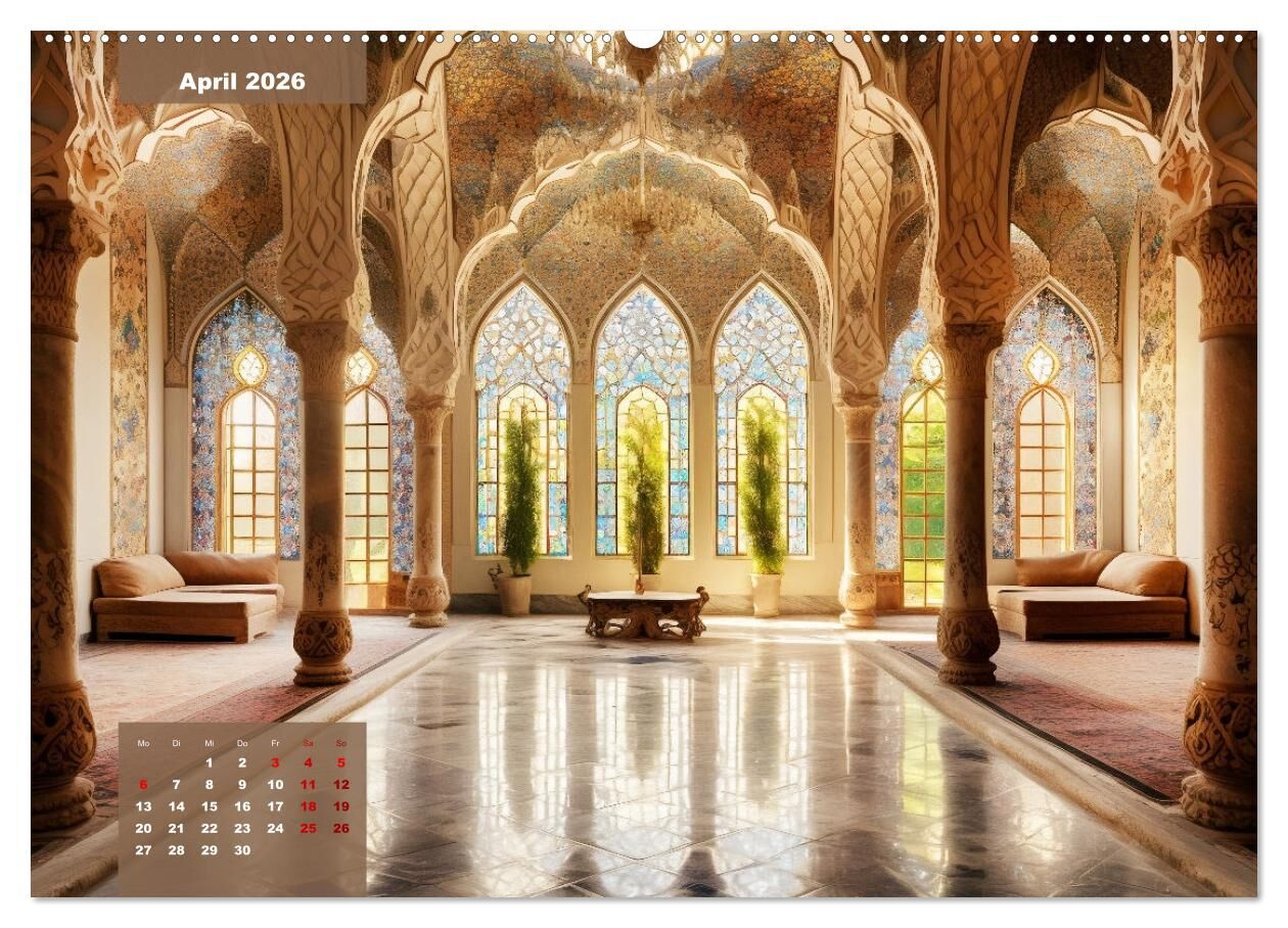 Tauchen Sie ein in die faszinierende Welt des Orients! Kostbare Mosaike und zauberhafte Gärten - dieser Kalender lässt Sie die Magie der Exotik spüren. Jeder Monat zeigt Ihnen, Dank einer KI, ein prächtiges Bild eines Palastes, der wie aus Tausendundeiner Nach...