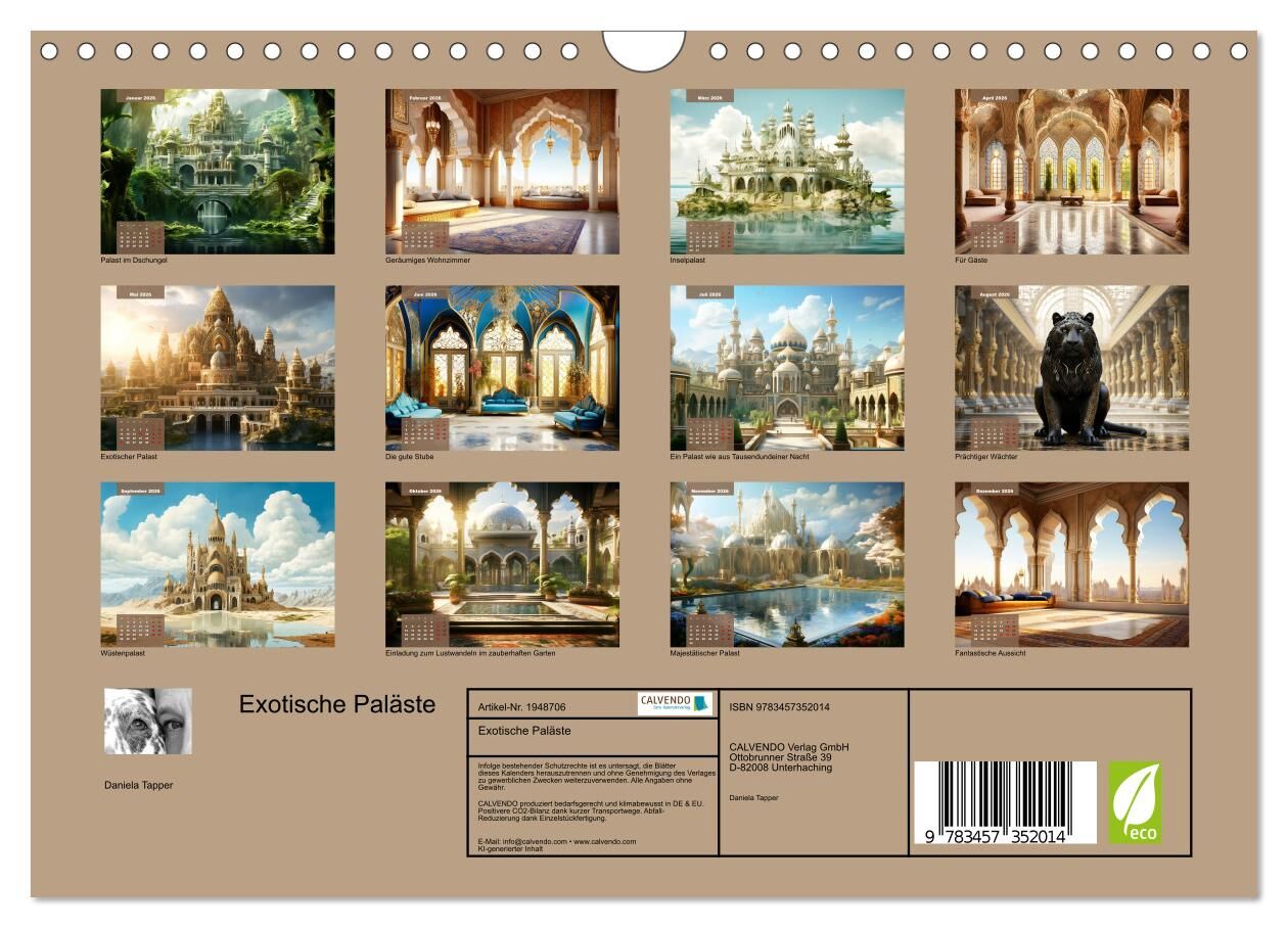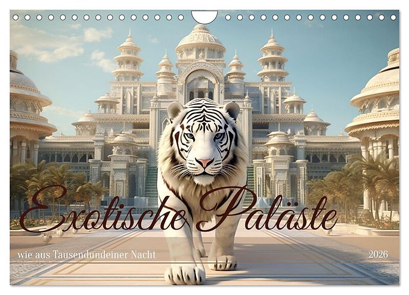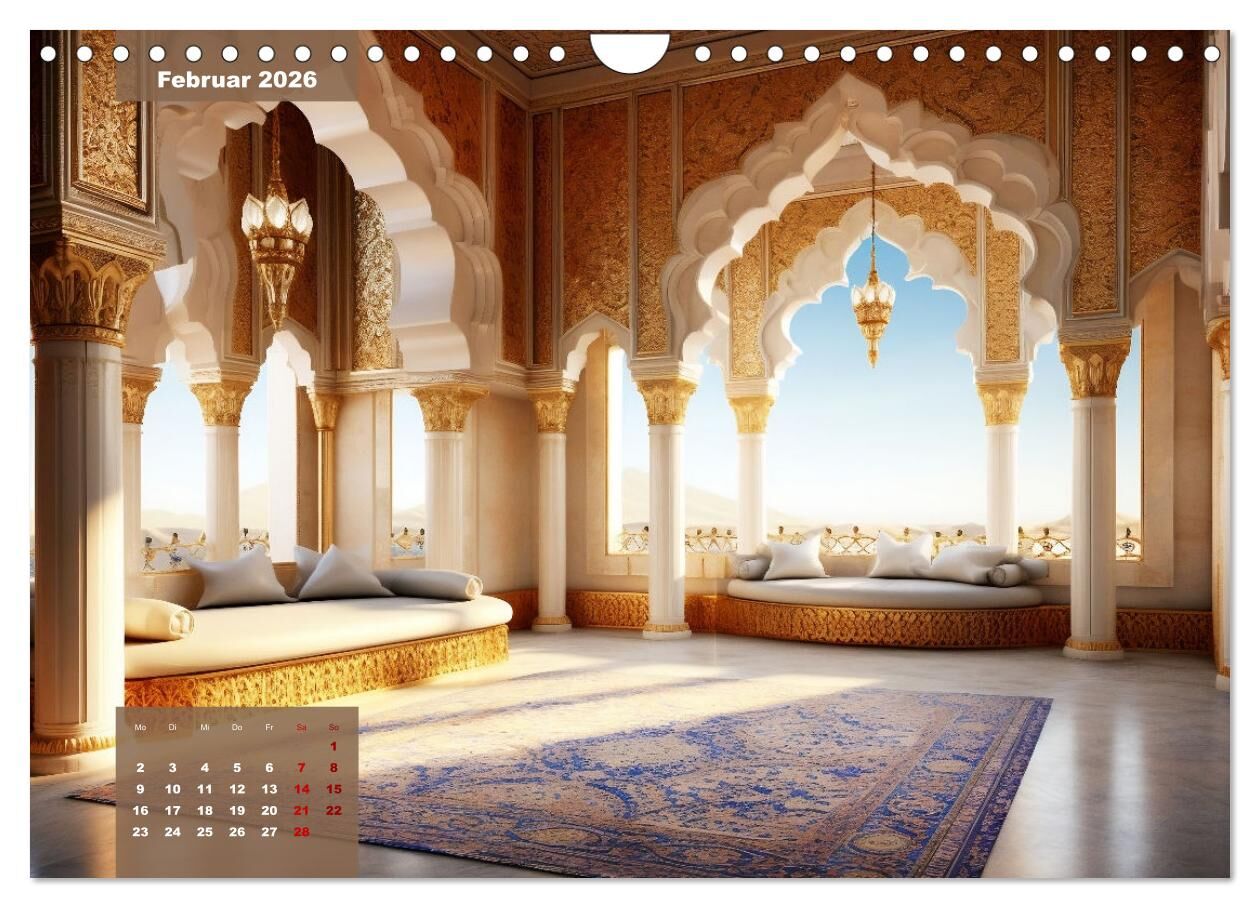 Tauchen Sie ein in die faszinierende Welt des Orients! Kostbare Mosaike und zauberhafte Gärten - dieser Kalender lässt Sie die Magie der Exotik spüren. Jeder Monat zeigt Ihnen, Dank einer KI, ein prächtiges Bild eines Palastes, der wie aus Tausendundeiner Nach...