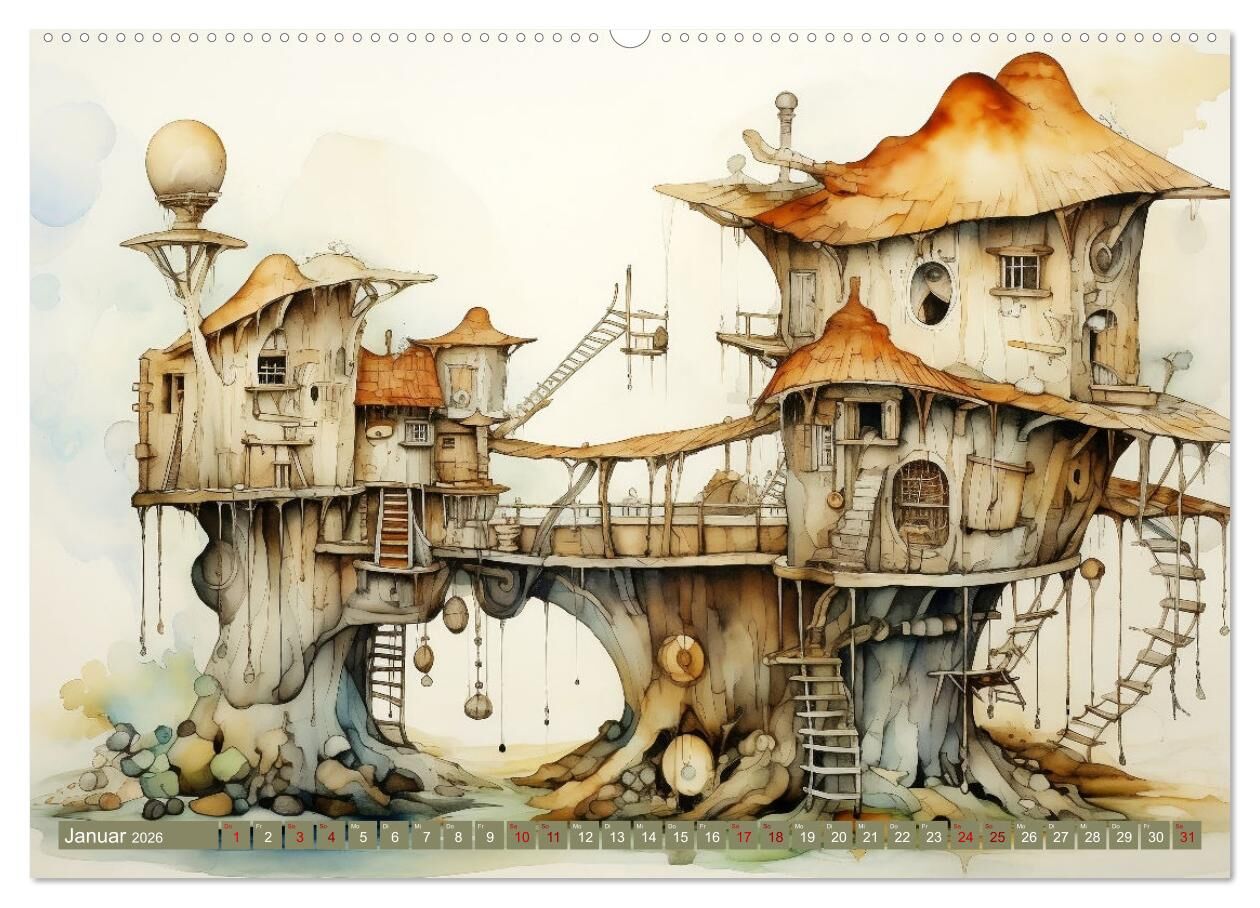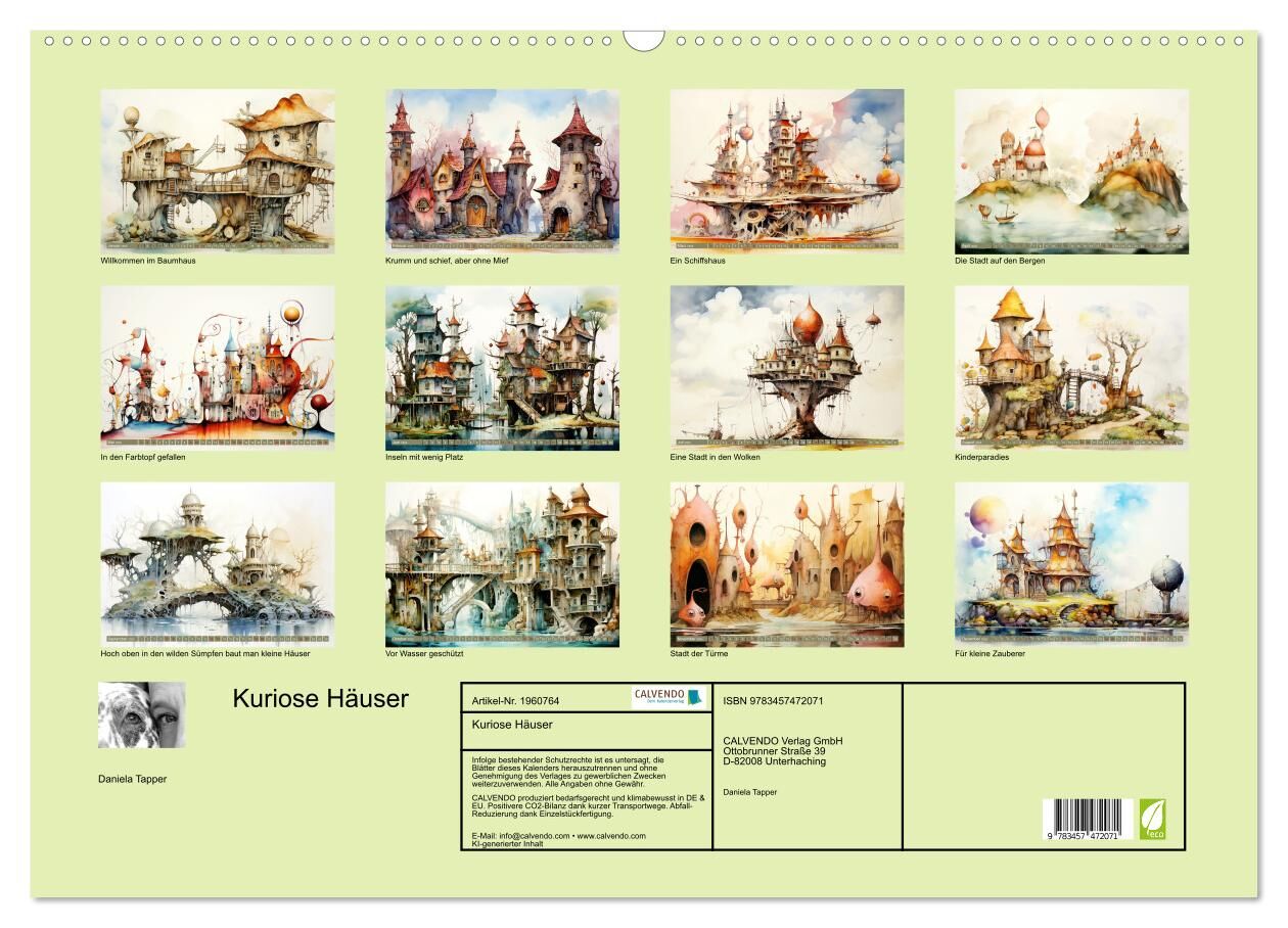 Haben Sie genug von langweiligen Kalendern, die immer nur die gleichen Bauwerke zeigen? Dann kommen Sie mit auf eine Reise ins Reich der Fantasie! Dieser Kalender zeigt Ihnen, mit Hilfe einer KI, jeden Monat ein anderes verrücktes, kreatives Haus, das mit leuc...