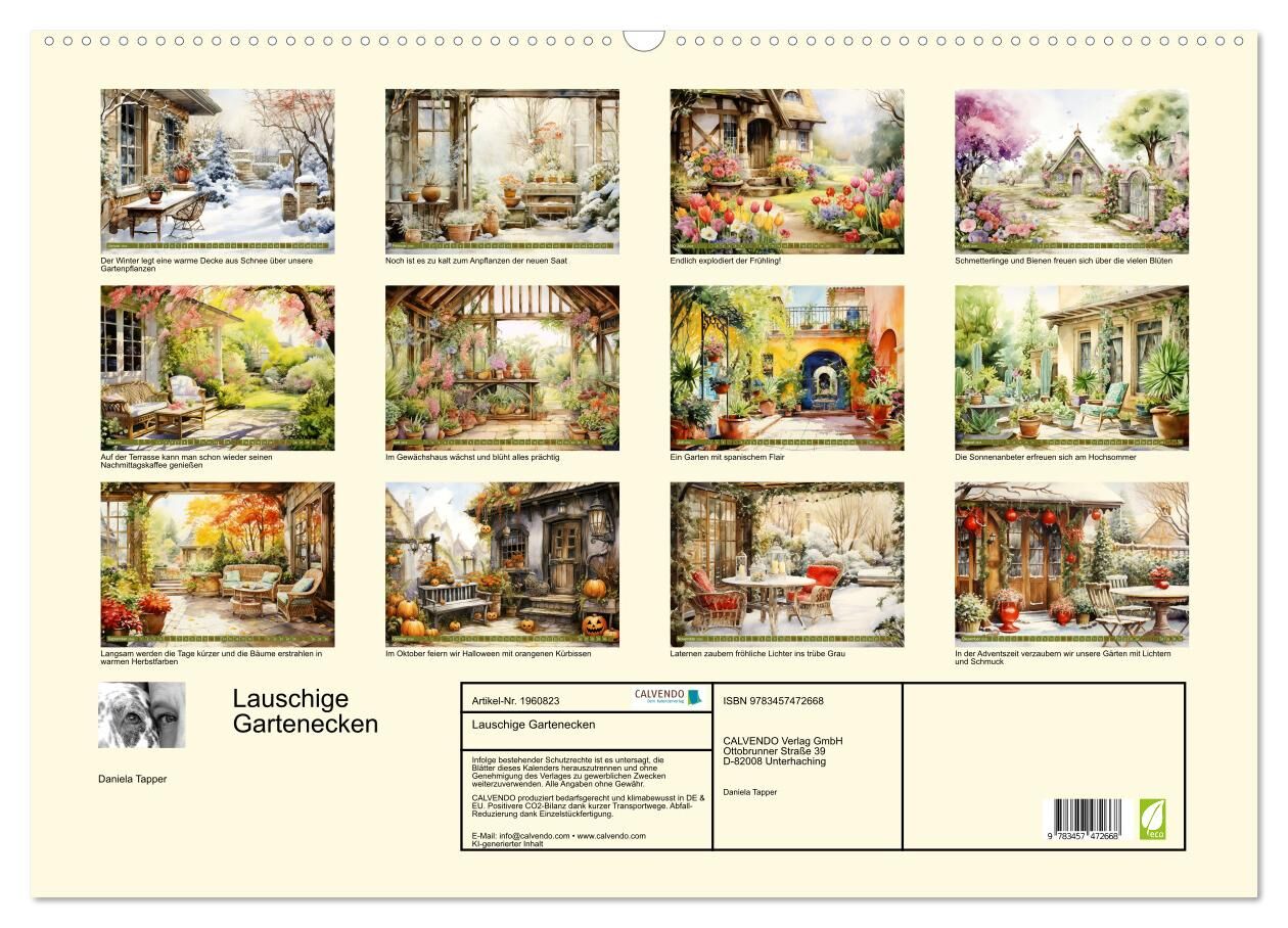 Jeder Monat zeigt Ihnen ein wunderschönes Aquarell von lauschigen Gartenecken, die zum Träumen und Entspannen einladen. Ob blühende Blumen, saftiges Grün oder gemütliche Sitzecken - hier finden Sie, Dank einer KI, Inspiration für Ihr eigenes grünes Paradies. D...