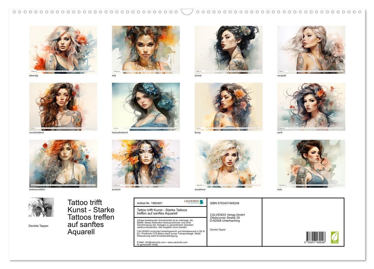 Dieser Kalender zeigt zwölf beeindruckende Porträts von Frauen, die ihre Persönlichkeit und Leidenschaft mit Tattoos zum Ausdruck bringen. Die Bilder sind, mit Hilfe einer KI, in Aquarell gemalt und verbinden Kunst und Körperkunst auf eine einzigartige Weise. ...