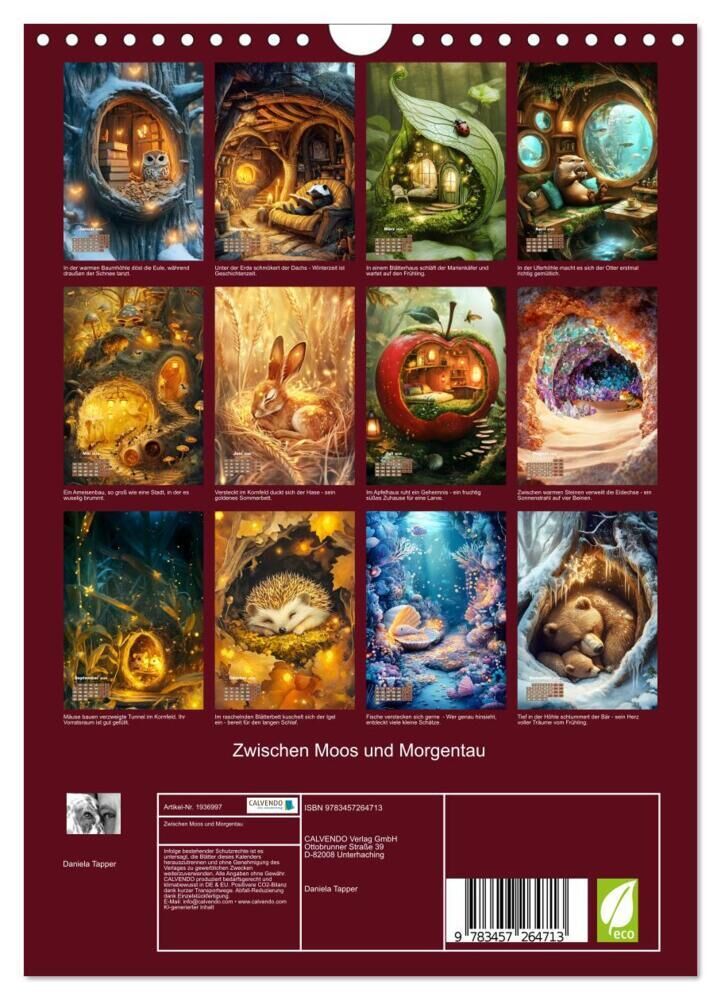 Dieser Kalender lädt dich ein auf eine märchenhafte Reise in die verborgenen Heime der wilden Tiere. Entdecke geheimnisvolle Fuchsbauten, gemütliche Eulennester und versteckte Bärenhöhlen - kunstvoll erschaffen mit der Magie künstlicher Intelligenz. Jeder Mona...