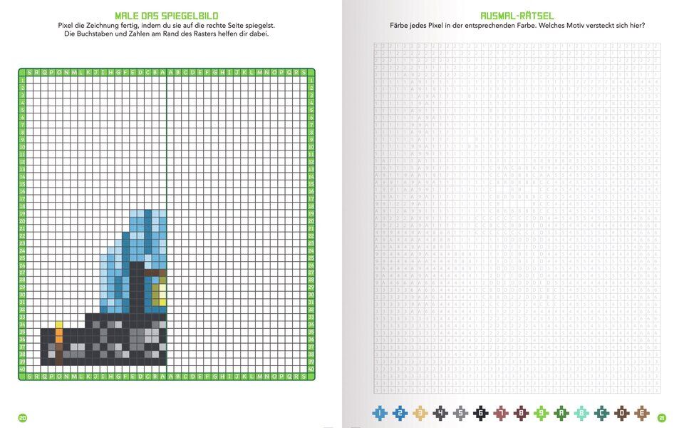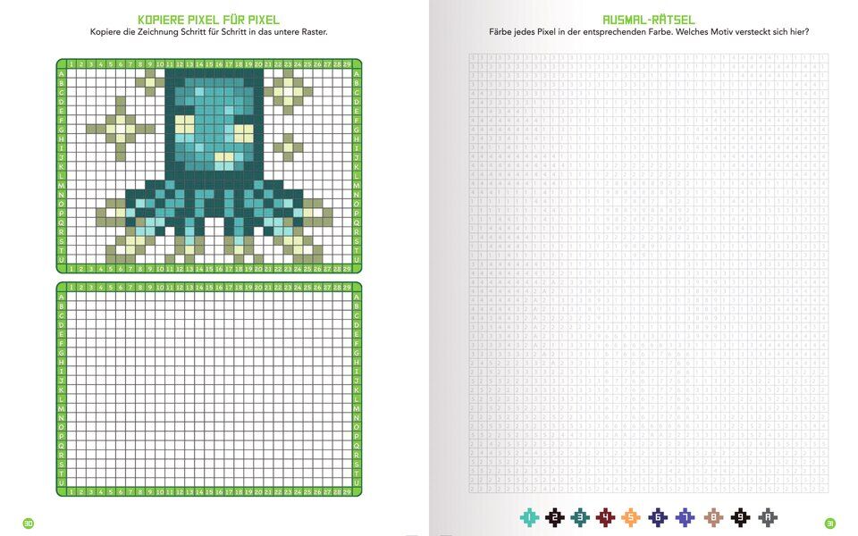 "Einfach eigene Bilder aus der Minecraft-Welt erschaffen Malen nach Zahlen und Buchstaben und versteckte Motive entdecken Minecraft-Motive Pixel für Pixel kopieren oder spiegeln"