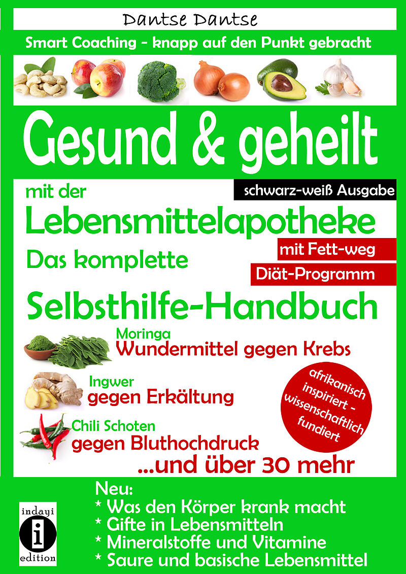 Ein Ratgeberbuch, das wirklich hilft und nachhaltig gesund, vital und jung macht. Mit Moringa einem Wundermittel aus Afrika kannst du dich vor Krebs und Alzheimer schützen oder ihre Heilung unterstützen. Mit Okra kannst du Wechseljahrbeschwerden beseitigen! Mit Papaya kannst du Cellulite und Akne bekämpfen! Über 20 Jahre lang kaum krank und nie Tabletten alles Dank einer gezielten Ernährung? Mit 50 so gesund, wie ein Mittzwanziger? Dieses Buch zeigt dir anhand der Selbsterfahrung des Autors, wie es geht In diesem Buch findet der Leser viele nützliche und ausführliche Informationen an einem Ort versammelt, es ist einfach geschrieben und für jeden leicht zu verstehen und beinhaltet neue Erkenntnisse, Tipps, Ratschläge, die dir sofort helfen und manche Beschwerden wie magisch verschwinden lassen. Dieses Buch versorgt dich mit ausführlichen Listen und Tabellen über: - Vitamine und Mineralstoffe: wo sie vorkommen, ihre Funktion, was ein Mangel verursacht - Zusatzstoffe (Konservierungsstoffe, Farbstoffe usw.) in Lebensmitteln, sortiert danach, wo man sie findet und was sie verursachen - Gifte, Chemikalien und krebserregende Substanzen in Lebensmitteln und Gegenmaßnahmen - Krankmachende Zusatzstoffen in Lebensmittel, tabellarisch - Gefährliche Lebensmittel für Schwangere, Lebensmittel die die Muttermilch vergiften und welche, die sie verbessern - Welche Lebensmittel welche Krankheiten verstärken oder gar verursachen - Krebserregende Stoffe in Babynahrung und Muttermilch erkennen und vermeiden - Basische, bittere, säuerliche Lebensmittel - Freie Radikale und Antioxidantien - Warum Milchprodukte, Zucker und Weizen Feinde unserer Gesundheit sind - Natürliche Antibiotika - Potenz- und luststeigernde Lebensmittel für Mann und Frau - Liste mit über 30 Krankheiten und den Lebensmitteln die sie bekämpfen - Zwei Programme zum Fett- und Gewichtsabbau - Und mehr Die integrierte Ernährungs- und Gesundheitstagebuch-Tabelle hilft dir und motiviert dich, deine Ziele zu erreichen indem du die Ergebnisse messen kannst. Dantse, Coach und Autor dieses Buches, war in den letzten 20 Jahren weniger als fünfmal beim Arzt und wenn, dann nur wegen seines Leistenbruchs. Seit Jahren hat er keine Erkältung, Migräne und in über 20 Jahren hat er keine einzige Tablette genommen. Bei seiner letzten ärztlichen Untersuchung bescheinigte ihm der Arzt die Gesundheit und körperliche Verfassung eines Mittzwanzigers, obwohl er 50 ist. Grund dafür ist vor allem seine Ernährung und sein Lebensstil, die er nun mit euch teilen möchte. Was er seine Kunden lehrt und nun auch den Lesern zeigt, setzt er an sich selbst um und das macht alles authentisch. Das ist fast wie ein Selbsterfahrungsbuch. Unserer Lebens- und Essgewohnheiten haben sich in den letzten Jahren gewandelt und dadurch bedingt haben bestimmte chronische Krankheiten wie Fettleibigkeit, Diabetes, Osteoporose, Herz-Kreislauf-Erkrankungen, Alzheimer, Parkinson, Krebs, oder Zahnerkrankungen besonders in den westlichen Ländern zugenommen. Wie können gesunde Ernährung und Bewegung uns helfen, das Risiko, an diesen chronischen Krankheiten zu erkranken, verringern oder sie so zu bekämpfen, dass sie gar nicht erst entstehen? Der Ernährungsspezialist Dantse zeigt dir in diesem Buch, wie du mit nur einigen Tipps gesund bleibst. Weit über 30 Beschwerden sind alphabetisch aufgelistet, mit den wichtigsten Lebensmitteln, die zur Heilung beitragen oder dich vor einer Erkrankung schützen. Der Autor erweitert das Wissen der Leser und bereichert sie mit sehr vielen neuen Informationen und mit exklusiven Erkenntnissen über neue Stoffe und Lebensmittel, wie selten ein Buch zuvor. Dies ist nur möglich, weil er vieles aus Afrika mitbringt, neue Lebensmittel mit erstaunlichen Heilkräften, die zwar Forschern und Wissenschaft, aber noch nicht dem normalen Menschen bekannt sind. Die Mischung aus wissenschaftlichen Fakten, seinen Lehren aus Afrika, eigenen Erfahrungen als Coach und Ernährungsberater macht dieses Buch zu einem Wissensschatz!