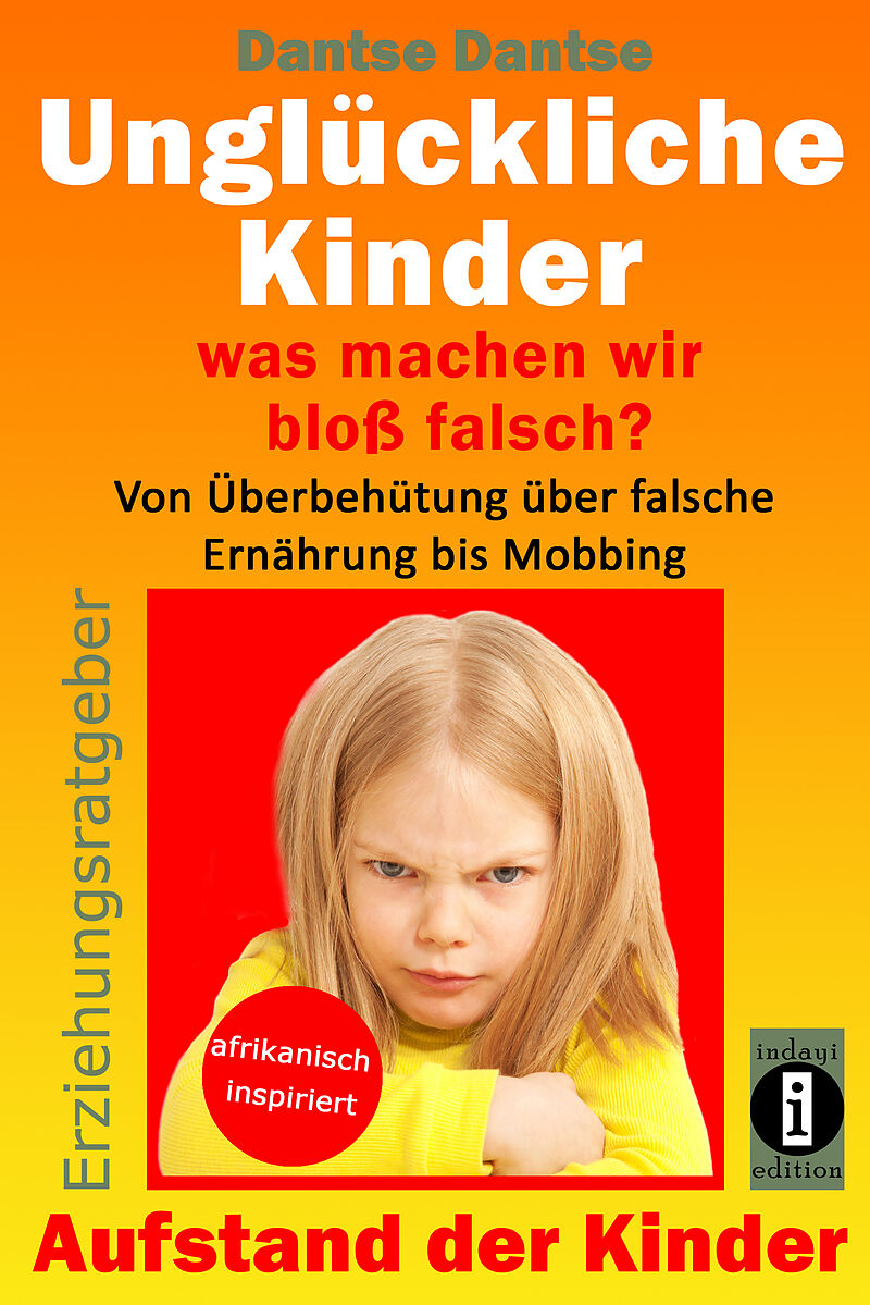 Warum werden unsere Kinder immer schwächer, antriebsloser, ängstlicher, anfälliger, unfähiger und vor allem unglücklicher und wir auch? Kinder, die unglücklich sind, sind nicht unglücklich gezeugt und geboren. Wir Eltern sind diejenige, die sie zum großen Teil zum Unglücklichsein programmiert haben, und das manchmal schon in der Schwangerschaft. Wir hypnotisieren unsere Kinder negativ. Der Autor Dantse zeigt uns, welche Fehler wir machen, damit wir sie vermeiden können und unsere Kinder glücklich und erfolgreich erziehen und er bereichert den Leser mit neuen Ansätzen aus seiner afrikanischen Kultur, die man sonst nicht in Betracht ziehen würde. Dieses Wissen teilt er mit seinen Lesern in dem Komplett-Erziehungsratgeber Aufstand der Kinder: Papa, Mama, jetzt rebelliere ich! Lasst mich einfach Kind sein!, den indayi edition veröffentlicht hat. Da es die Philosophie von indayi edition ist, den Lesern so viel Auswahlmöglichkeiten wie möglich zur Verfügung zu stellen, d.h., Lesern, die wenig Geld haben, oder wenig Zeit um dicke Bücher zu lesen, die Möglichkeit zu geben, kleinere Teilbände zu kaufen, gibt es den Komplett-Erziehungsratgeber Aufstand der Kinder auch in 2 Teilen: Unglückliche Kinder was machen wir bloß falsch? Von Überbehütung über falsche Ernährung bis Mobbing und Unglückliche Kinder noch mehr Dinge, die wir falsch machen können: Von Ängsten über Urvertrauen bis Pubertät Auf diese Weise kannst du als Leser den Themenbereich auswählen, der dich mehr anspricht, bzw. für weniger Geld erst einmal mit einem Buch starten und bei Gefallen das zweite erwerben. In diesem hier vorliegenden Band Unglückliche Kinder was machen wir bloß falsch? findest du folgende Themen: Die Erziehung der Eltern • Auseinandersetzung mit der eigenen Kindheit • Schlechte Abnabelung von den eigenen Eltern • Negative Programmierung in der Kindheit • Stress in der Schwangerschaft • Überforderung, Druck, Stress und Depression • Geringes Selbstwertgefühl der Eltern • Unglückliche Eltern • Gewalt, Drogen, Alkohol • Eine Mutter ohne Weiblichkeit • Sexuelle Frustration • Mangelnde Liebe und Selbstliebe der Eltern Falscher Erziehungsstil der Eltern • Überbehütung und Vernachlässigung • Burnout- und Depression-fördernde Erziehung • Antiautoritärer und autoritärer Stil • Grenzen- und Respektlosigkeit • Kinder zur Krankheit konditionieren • Falsche Ernährung, die zu Übergewicht führt • Erziehung zu Unselbständigkeit und Abhängigkeit • Schlechte Abnabelung der Kinder zu früh oder zu spät • Die Erbschaft ein Instrument der Machterhaltung • Zu frühe Selbständigkeit der Kinder • Perfektionsdrang • Zu viele Erklärungen und Gespräche • Falsche Gerechtigkeit • Kinder nicht lehren zu geben • Warnung, Angst und Sorge als Erziehungsmethode • Zu viel Lob, falsches und unangebrachtes Lob, zu viel Kritik • Gewalt in der Erziehung • Selbstlose Erziehung ist eine Selbstlüge • Sexuelle Belästigung von Kindern • Mobbing innerhalb der Familie
