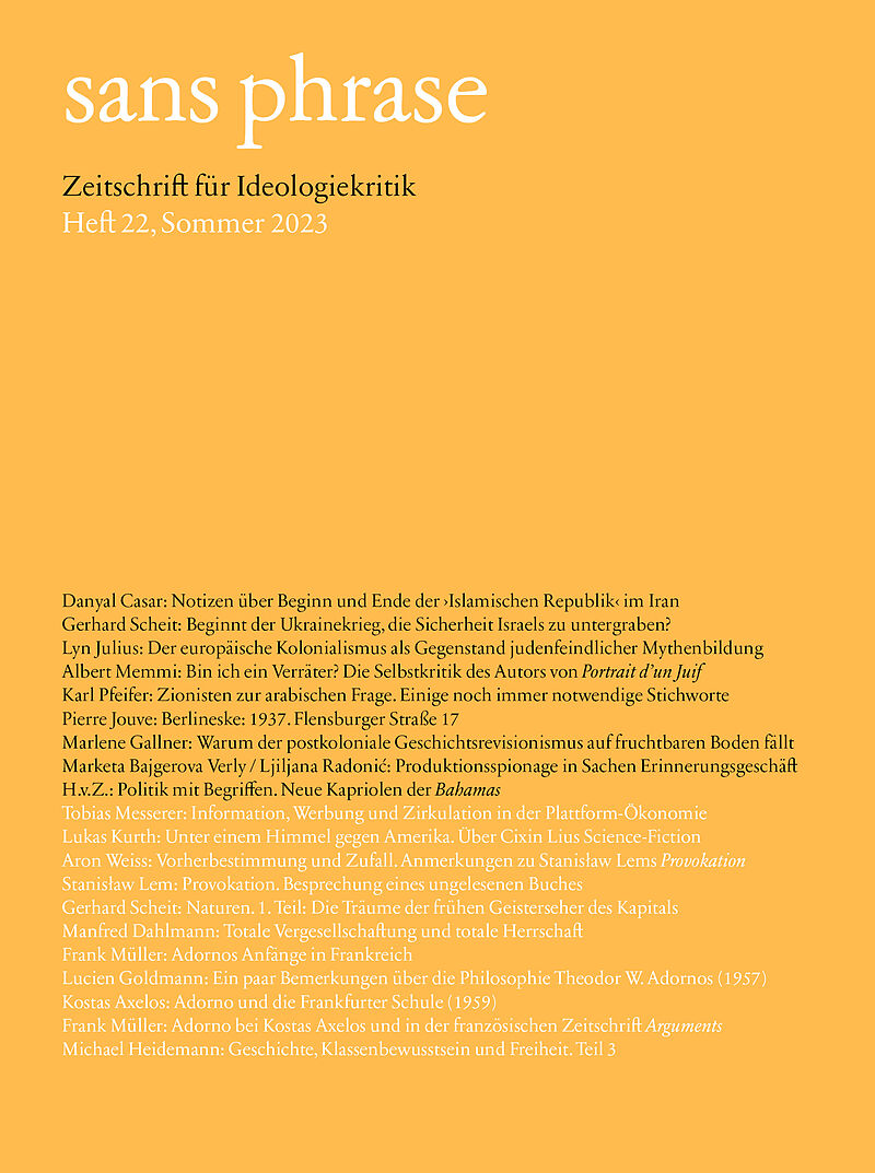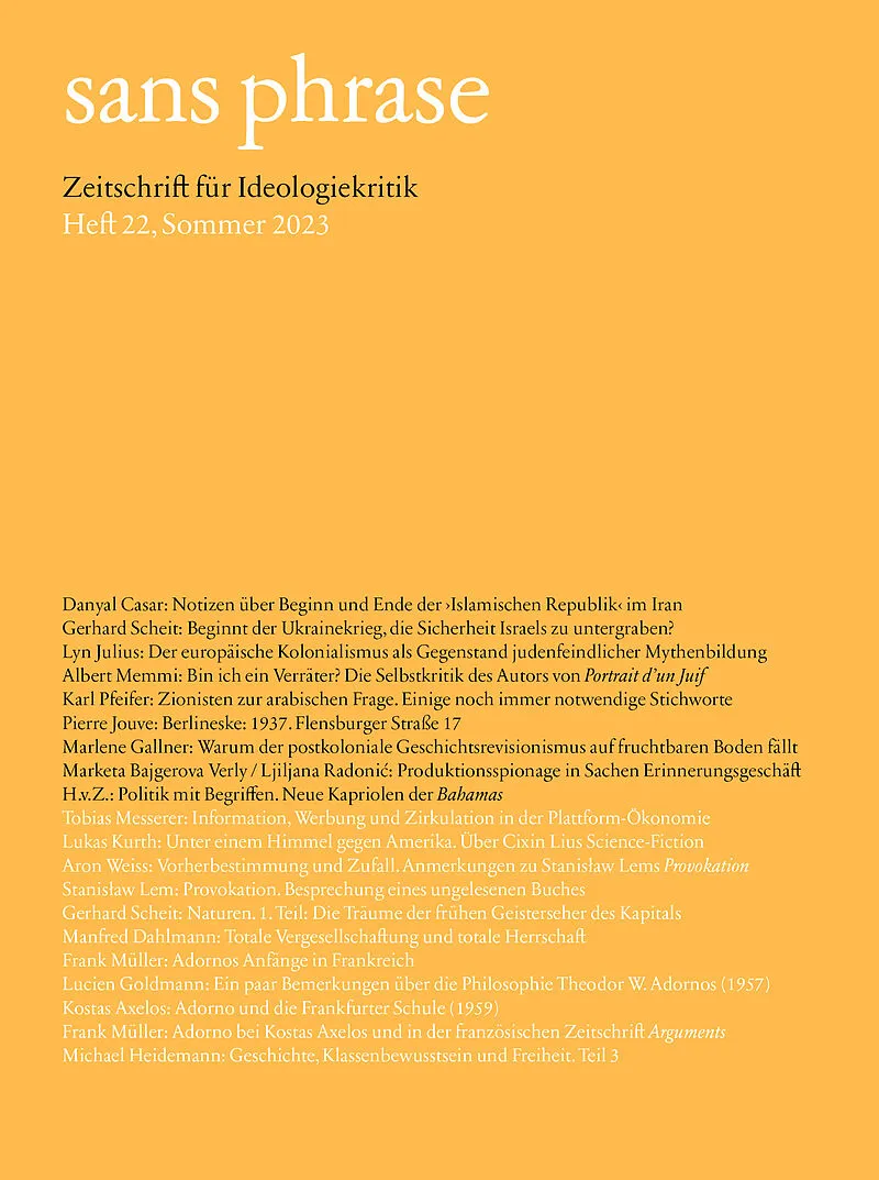 Notizen über Beginn und Ende der khomenistischen Despotie Untergräbt der Ukrainekrieg die Sicherheit Israels? Europäischer Kolonialismus als Gegenstand judenfeindlicher Mythenbildung Albert Memmis Selbstkritik am Portrait eines Juden Zionistische Stichworte vo...