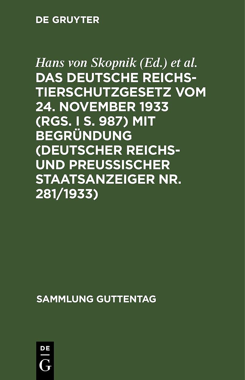Das deutsche Reichs-Tierschutzgesetz vom 24. November 1933 (RGS. I S. 987) mit Begründung (Deutscher Reichs- und Preußischer Staatsanzeiger Nr. 281/1933)