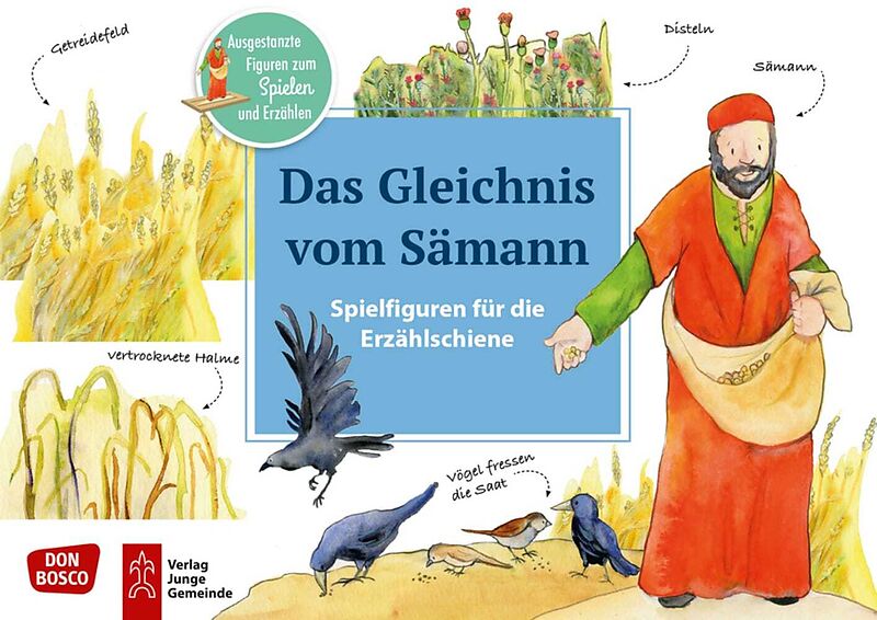 Mit den Bibel-Spielfiguren spielen die Kinder das Gleichnis vom Sämann auf der Erzählschiene nach. Ein Bauer sät Getreide aus. Manche Körner fallen auf den Weg, andere auf steinigen Boden und wieder andere in die Dornen. Nur die Körner, die auf guten Boden fal...
