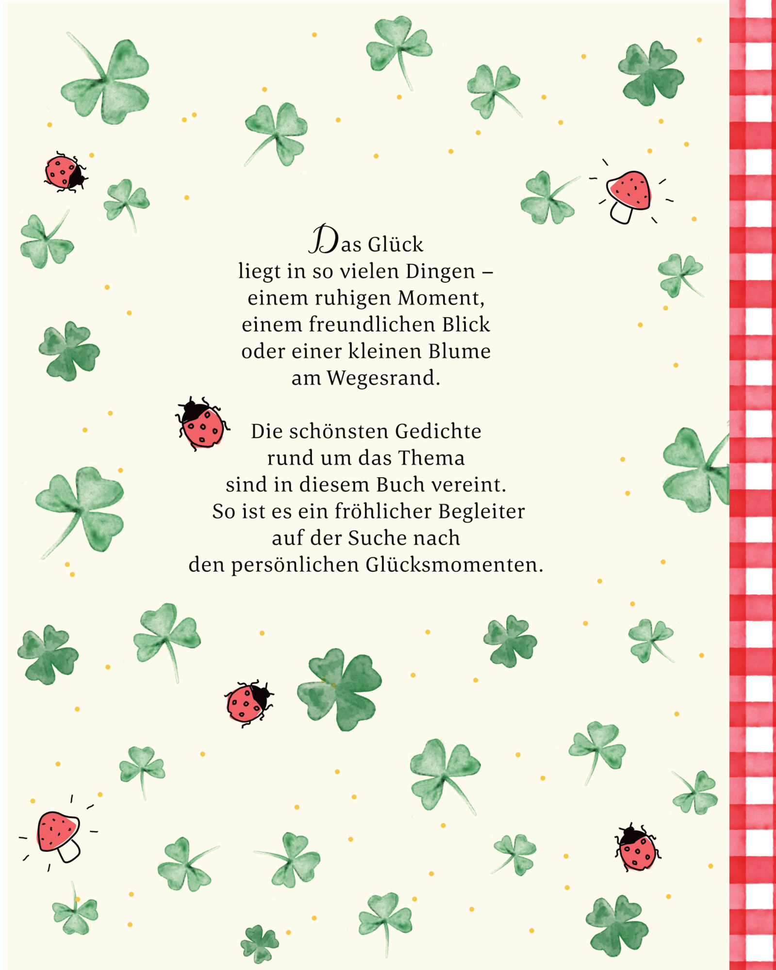 Glück haben ist Glück, aber glücklich sein ist eine Kunst. Das Glück liegt in so vielen Dingen einem ruhigen Moment, einem freundlichen Blick oder einer kleinen Blume am Wegesrand . Die schönsten Gedichte rund um das Thema sind in diesem Buch vereint. Es ist ...